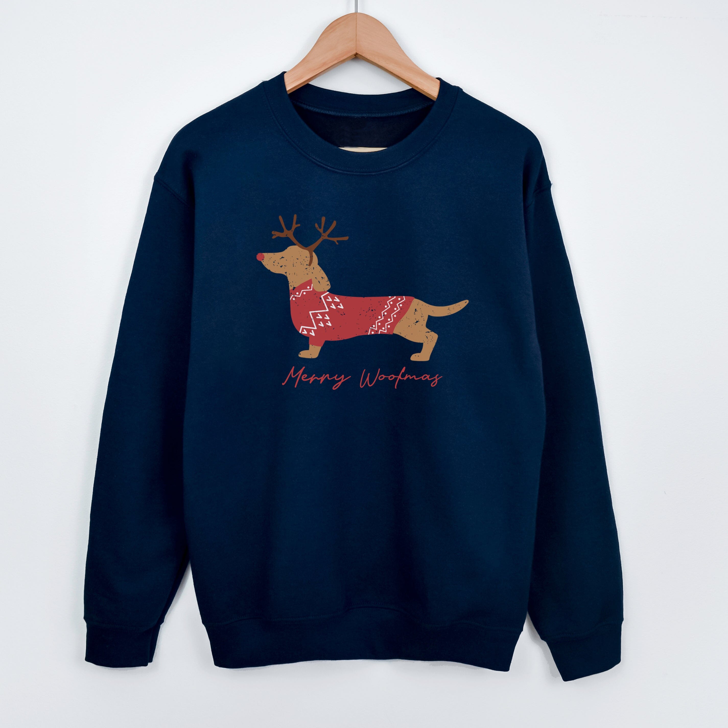 We had to have a festive dachshund in our Christmas Collection! This navy sweatshirt features a sausage dog illustration, in a modern, distressed style with the words 'Merry Woofmas'.