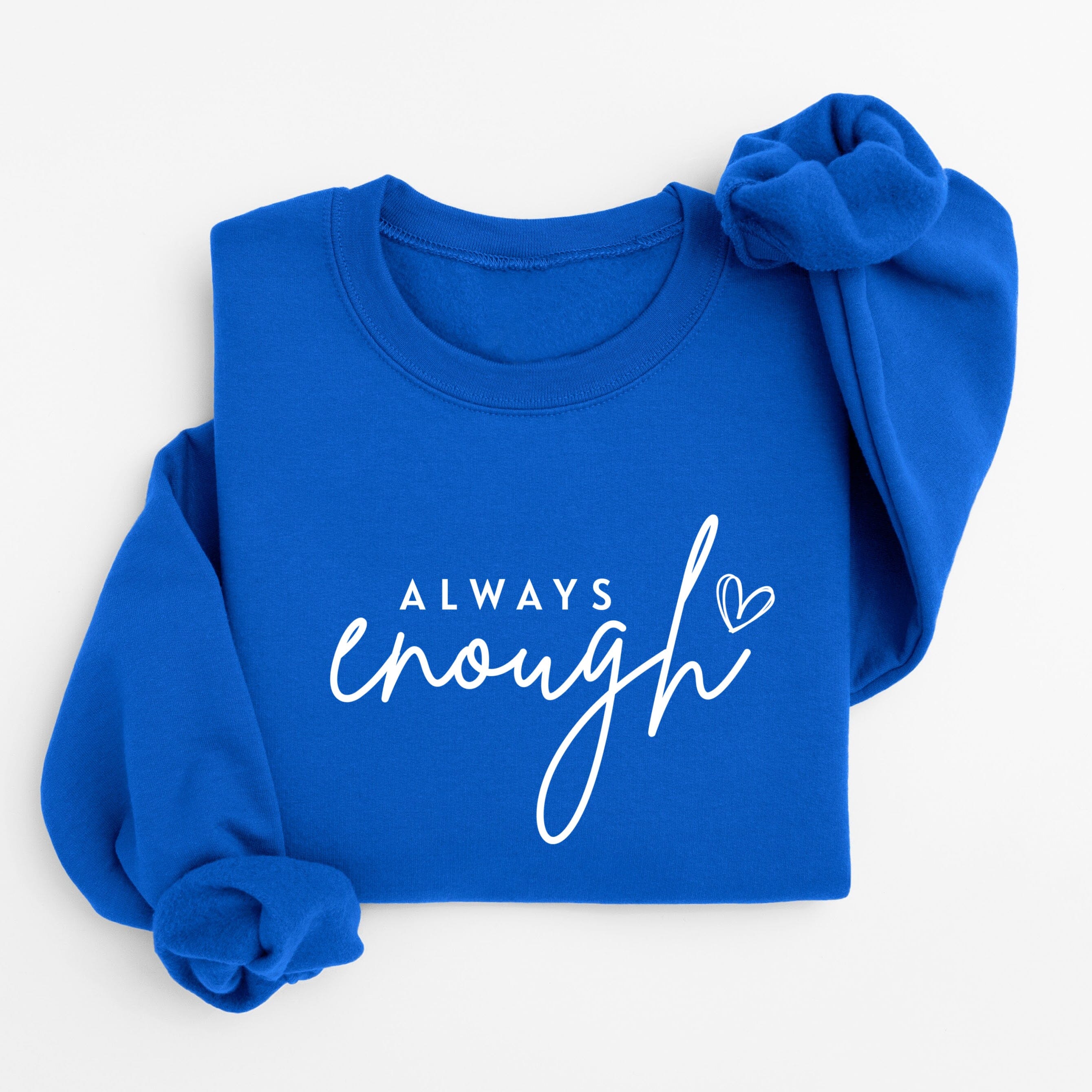 A reminder that you are always enough. This gorgeous bright royal blue ladies sweatshirt features a chic design in white.