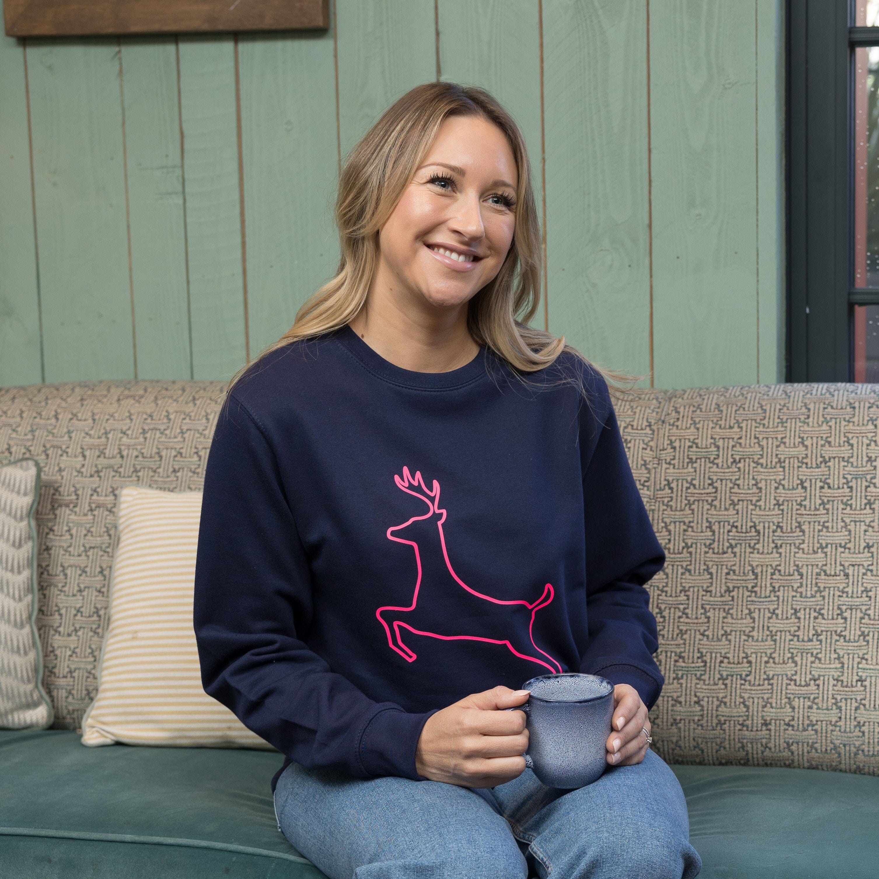 > a navy sweatshirt with a neon pink leaping stag.