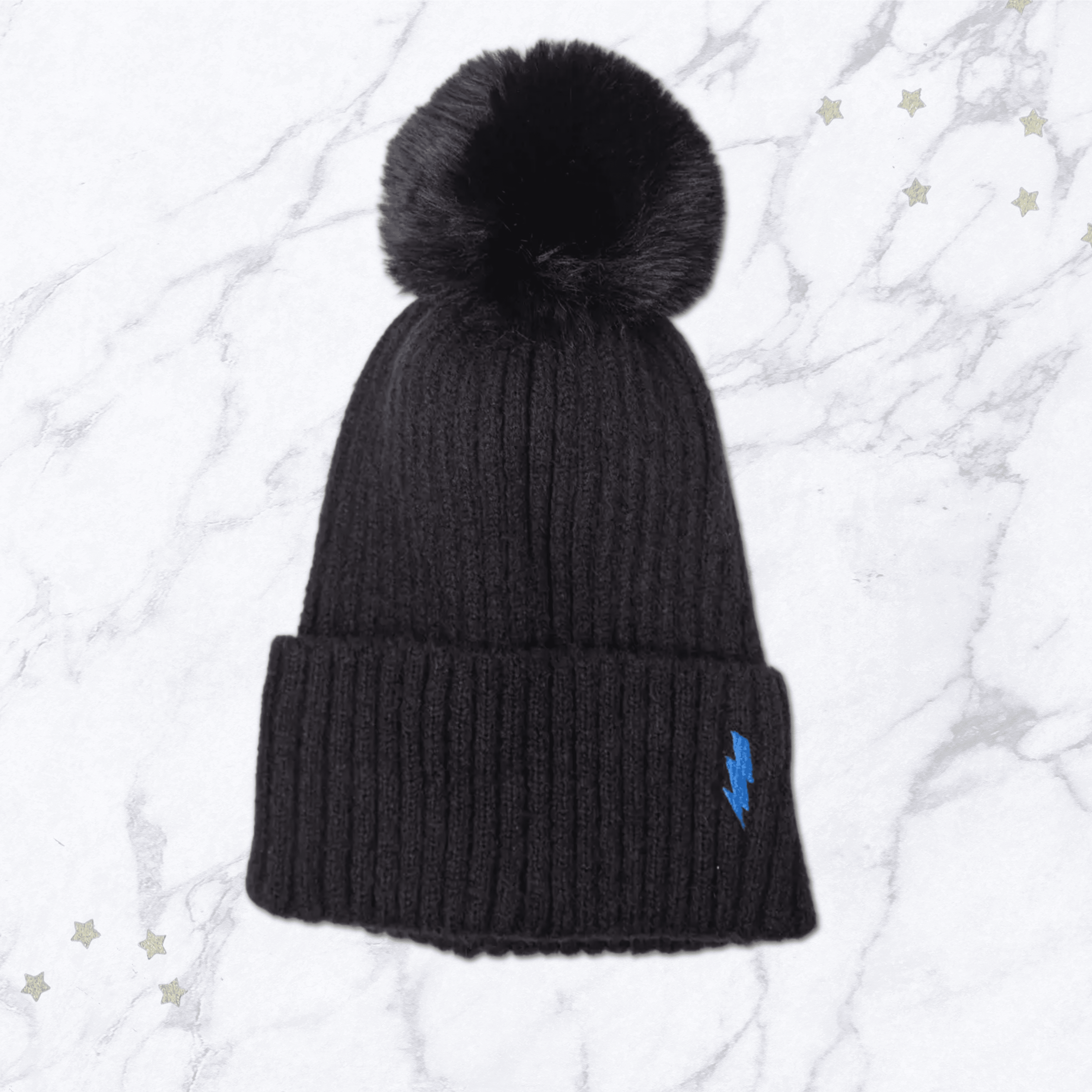 This lovely supersoft beanie style hat has a gorgeous embroidered lightning bolt in royal blue.