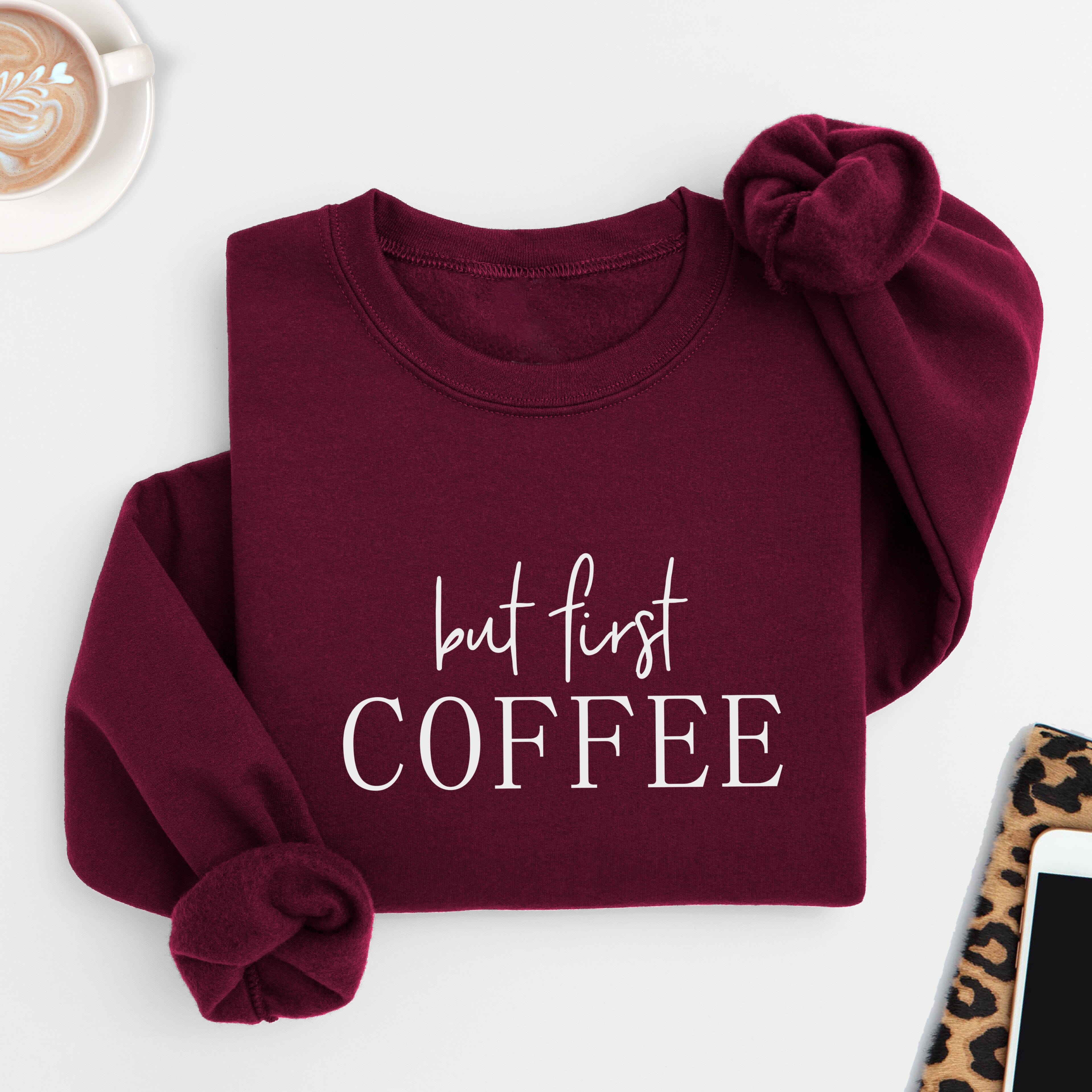 In modern burgundy, it has the words 'But First Coffee' in white.