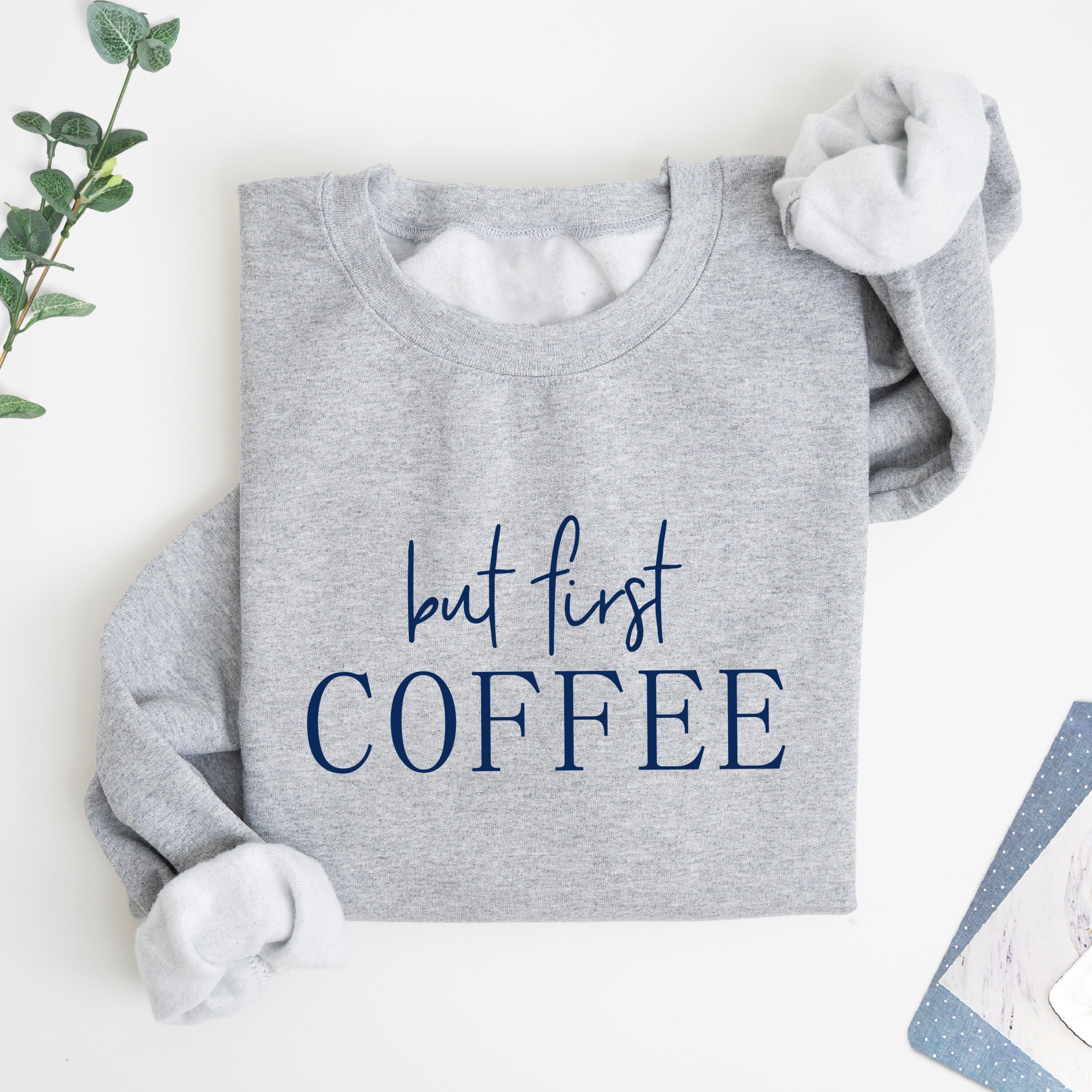 This sweatshirt is ideal for everyone who needs their coffee! In versatile heather grey it features a modern design with the words 'But First Coffee' in navy blue.