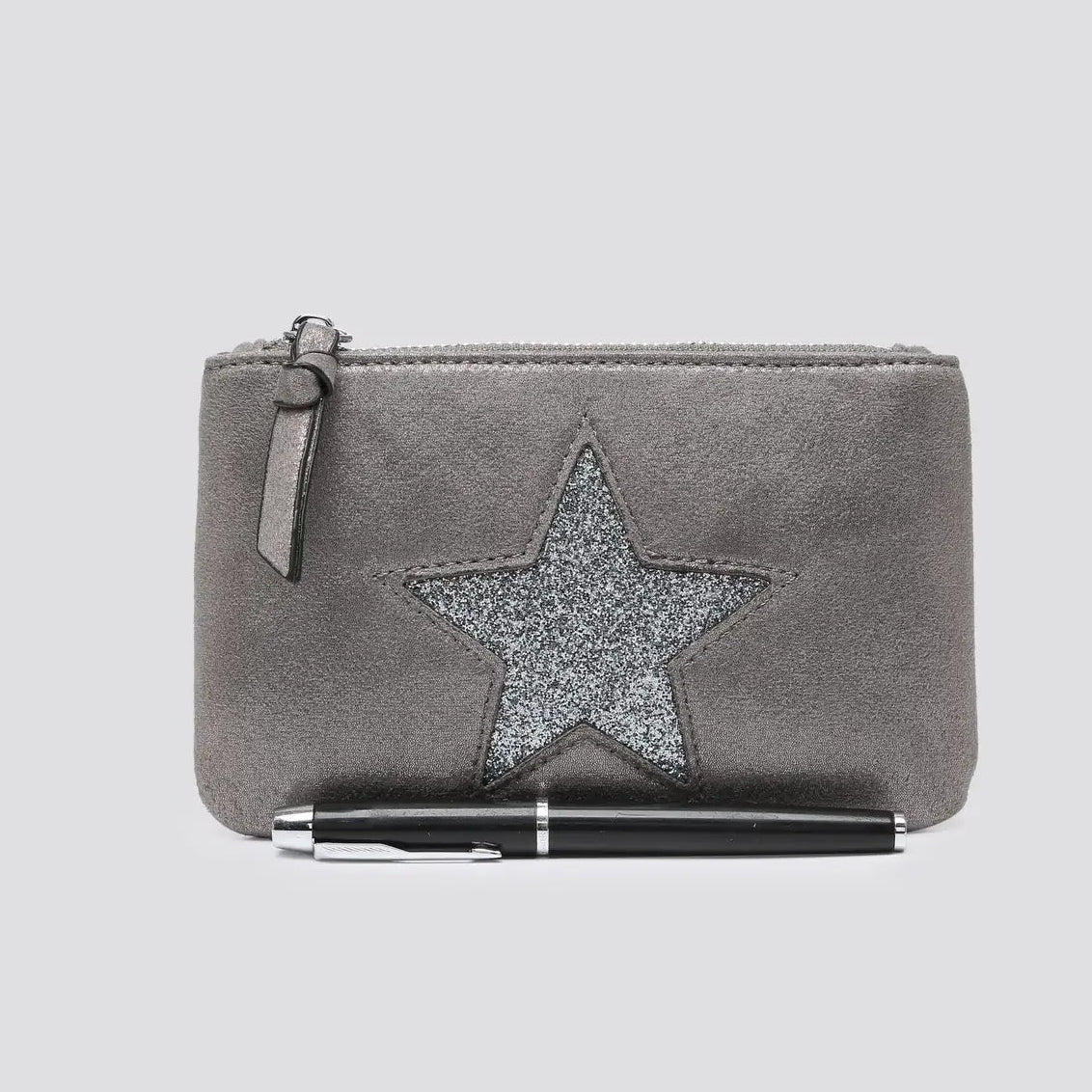 > a gorgeous shimmering fabric silver purse with a glitter star worth £7