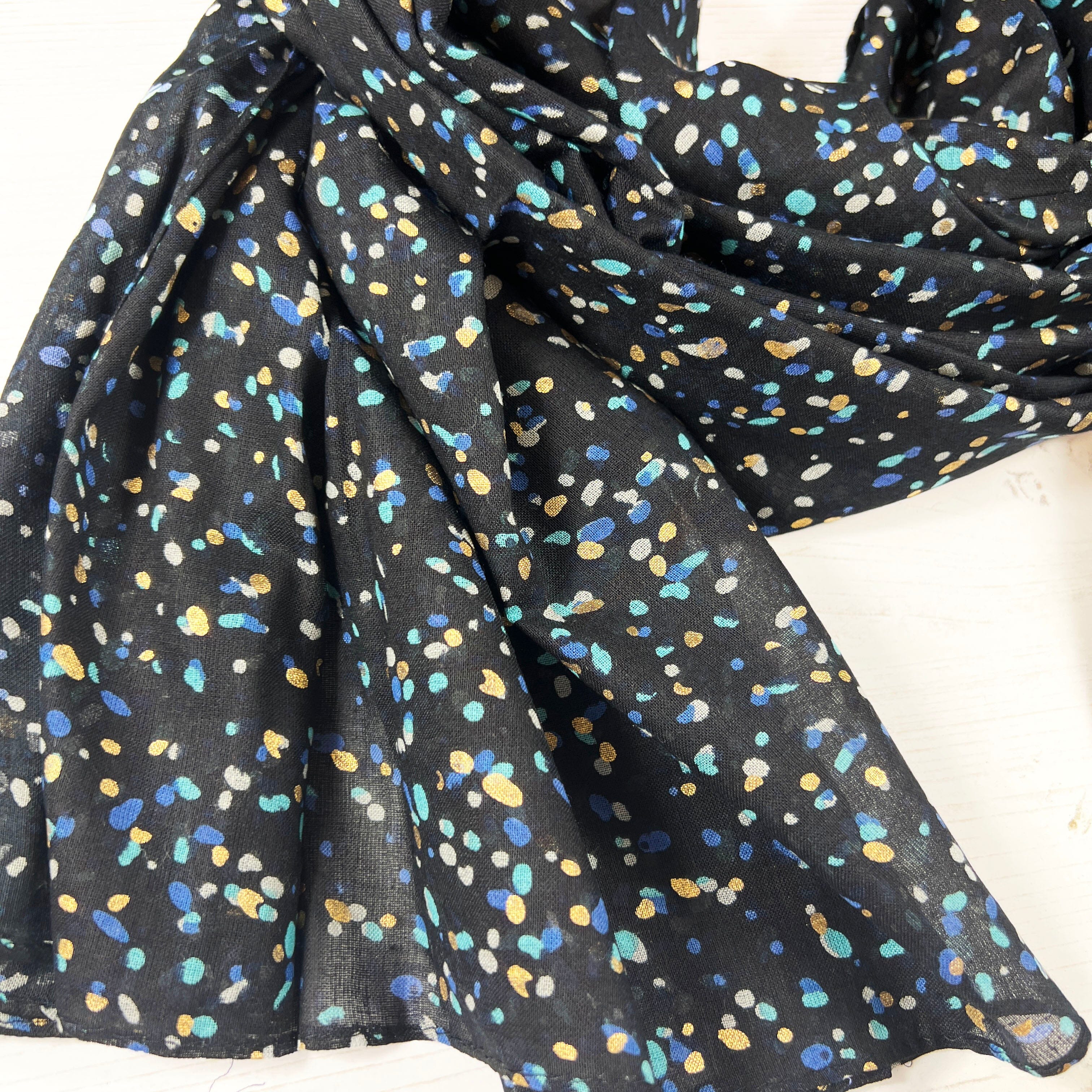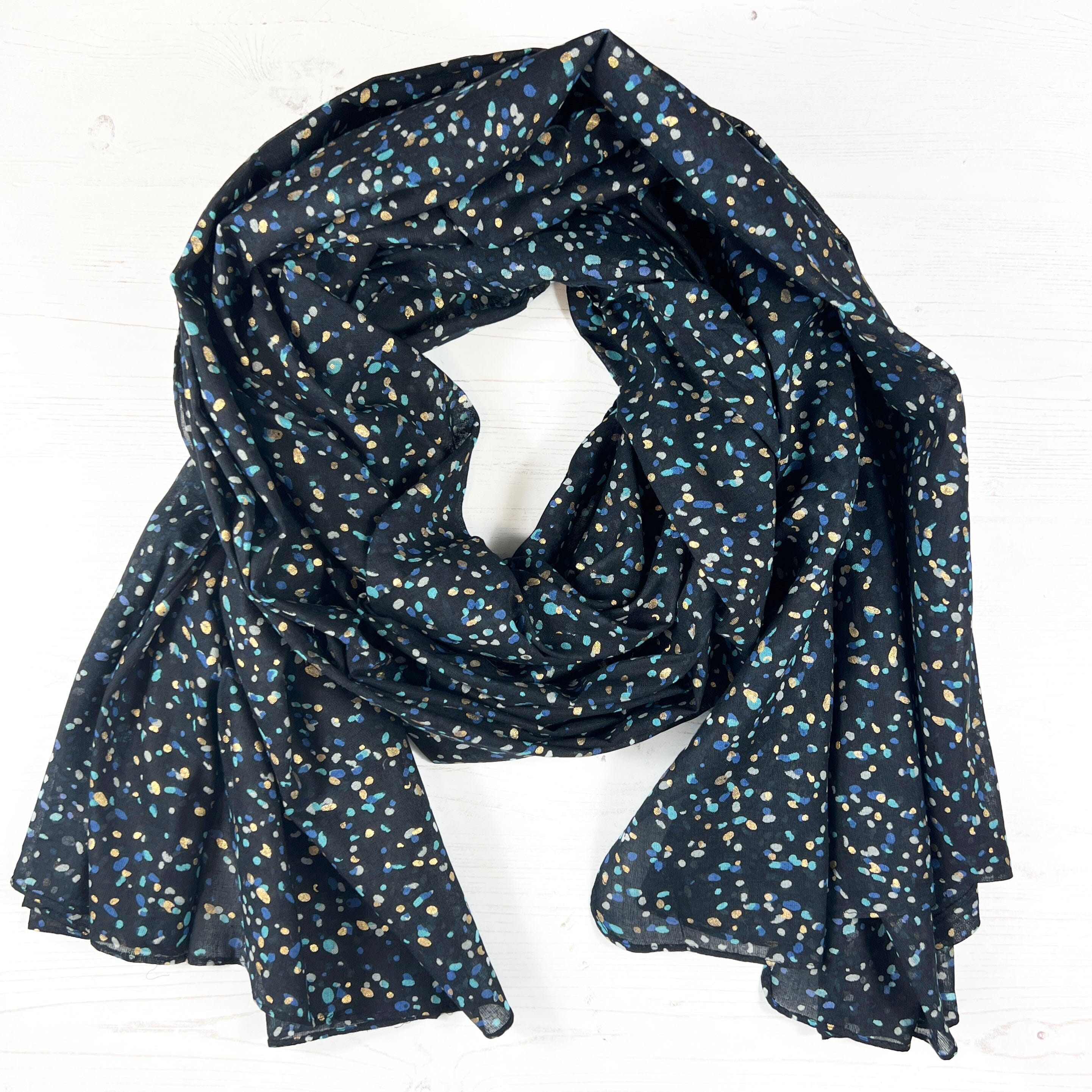 This lovely scarf features a dotty, spotty pattern of blues and metallic gold.