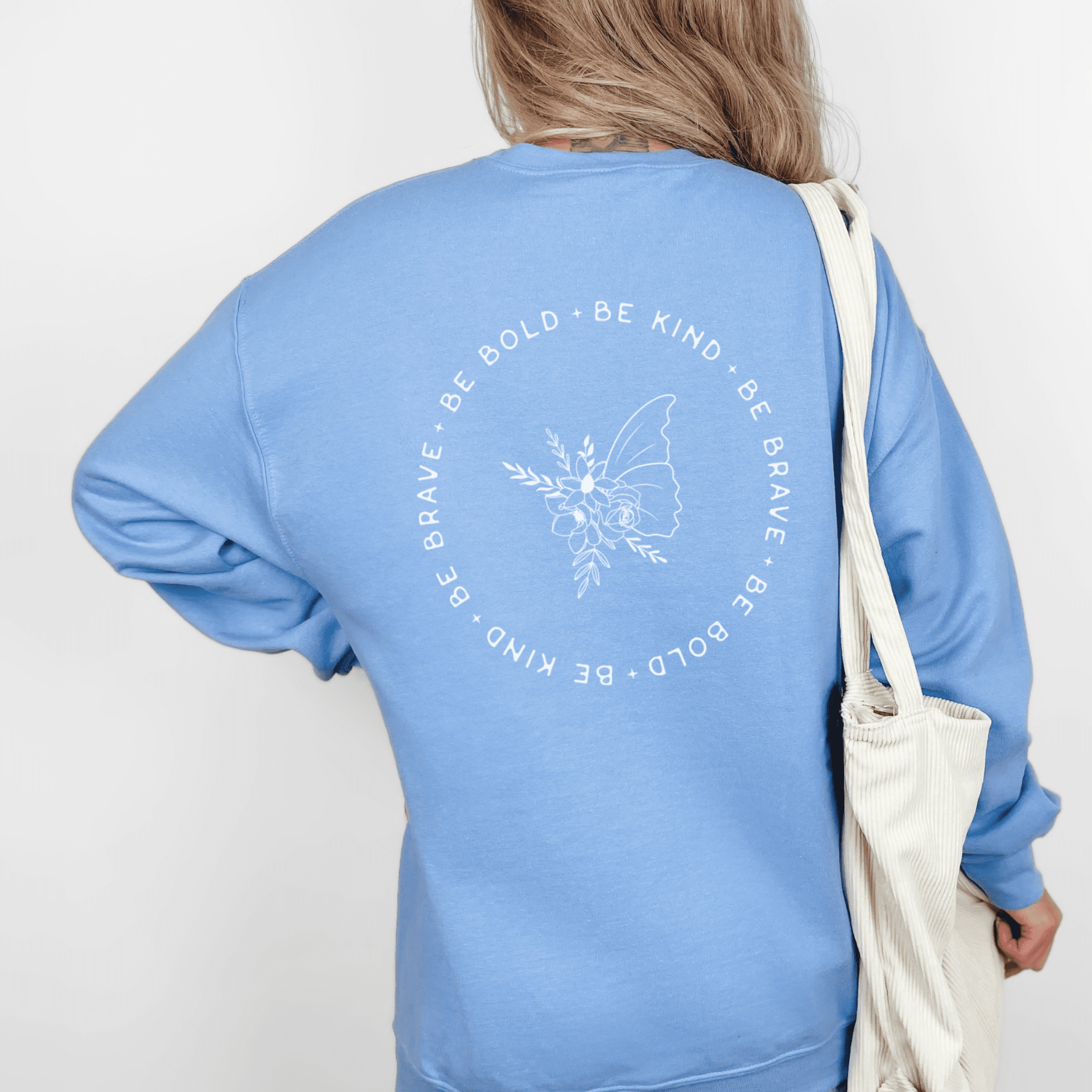 In gorgeous cornflower blue, this lovely sweatshirt features a gorgeous design on the back with lots of positivity.