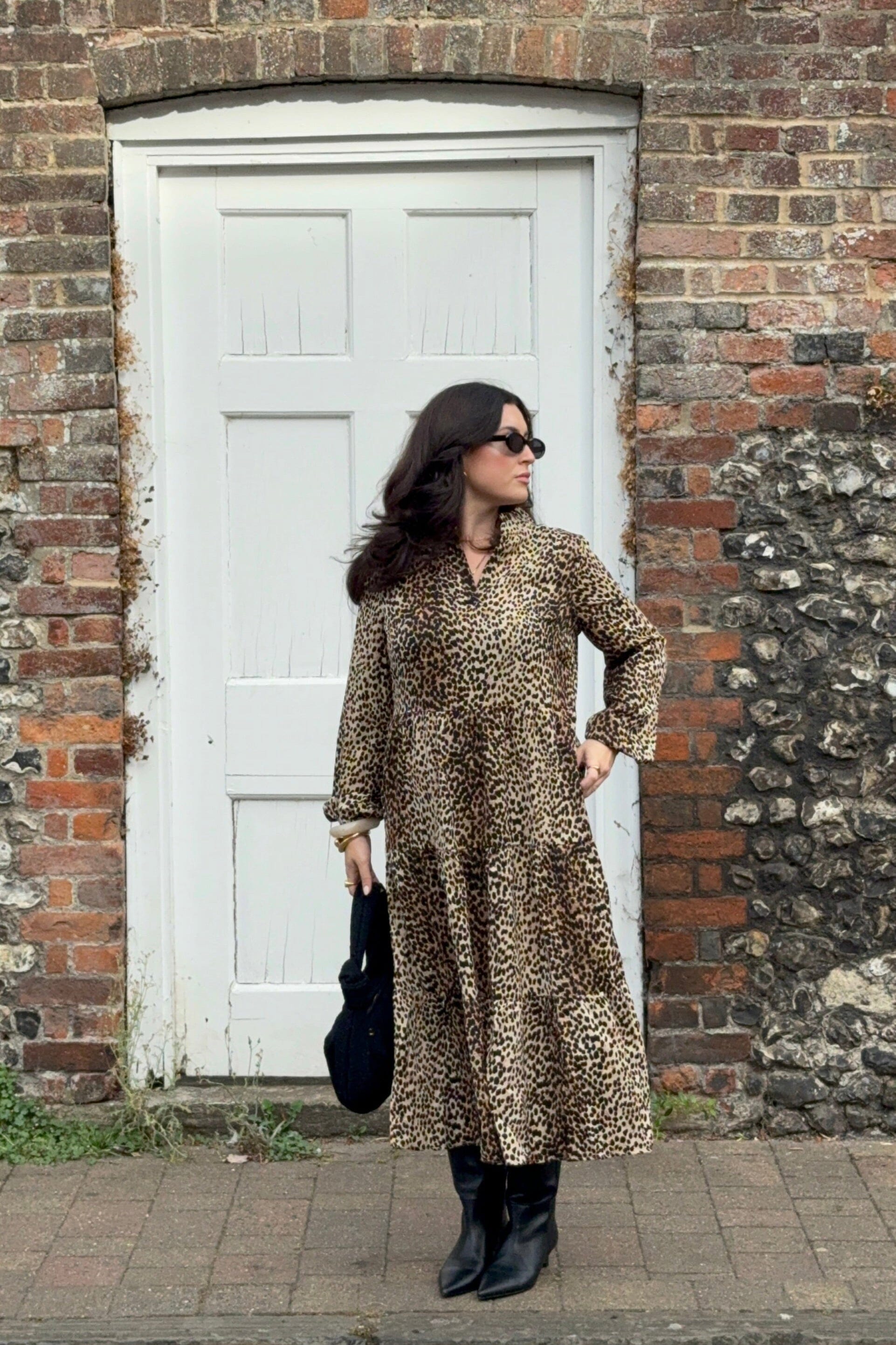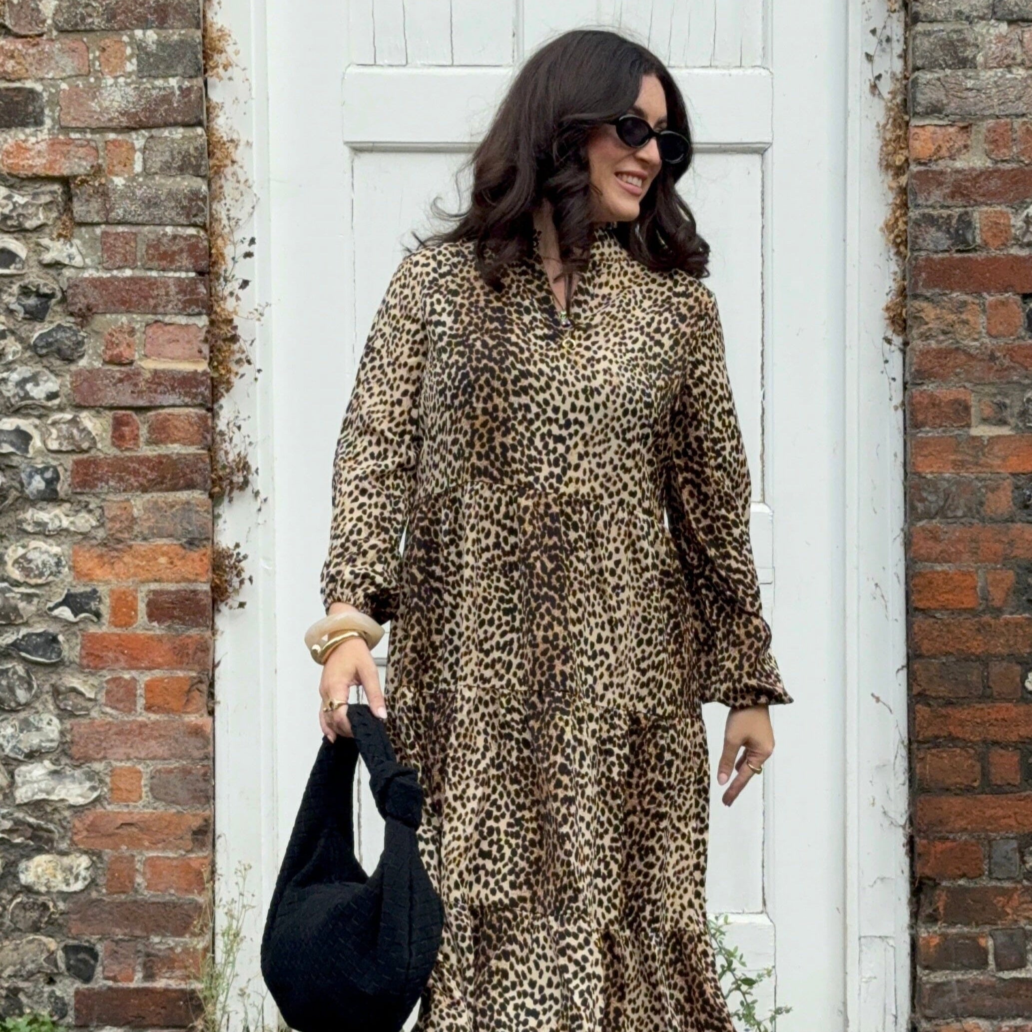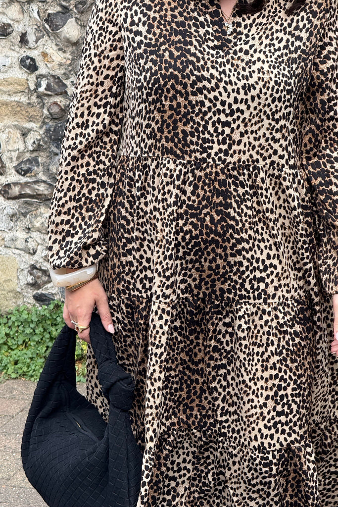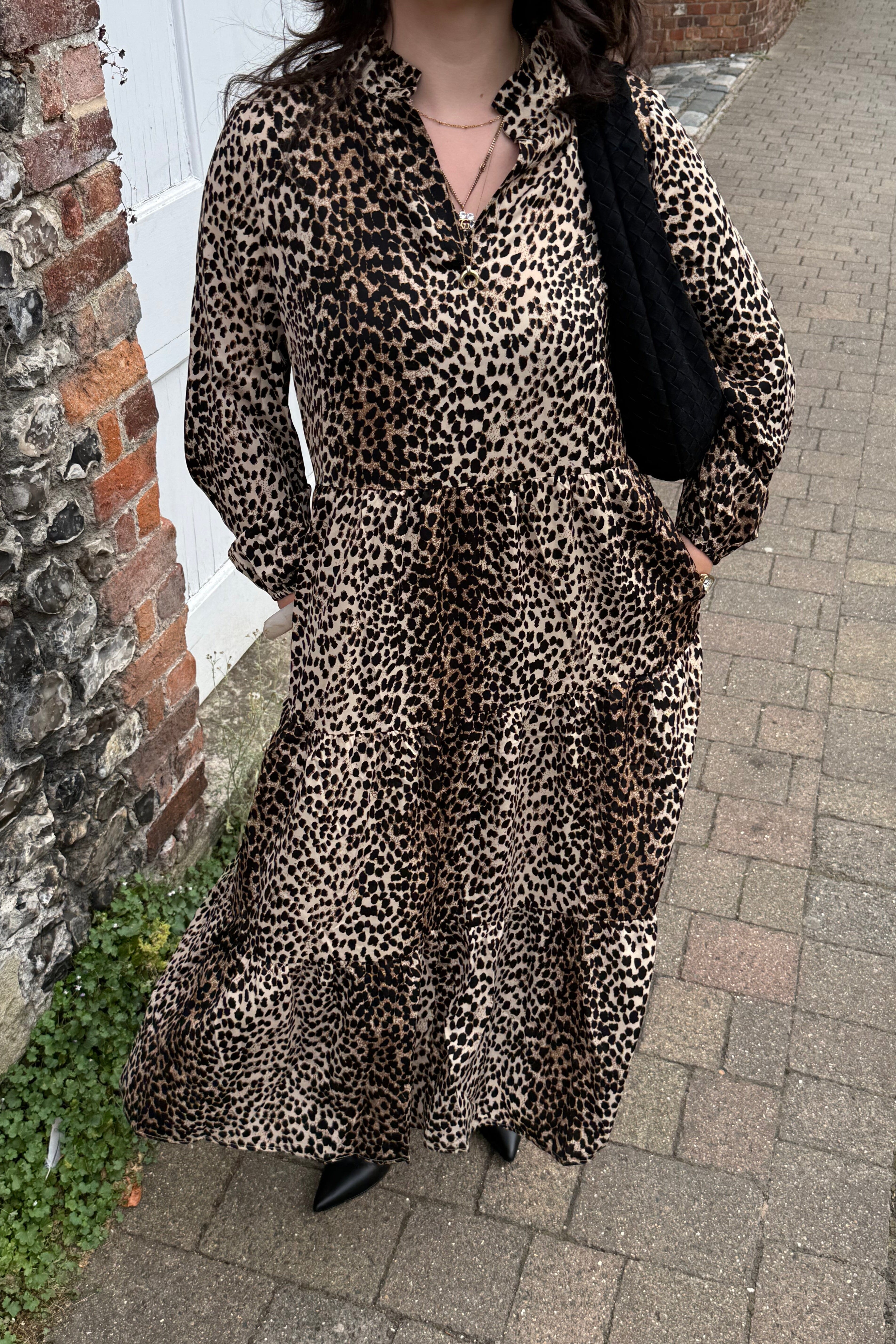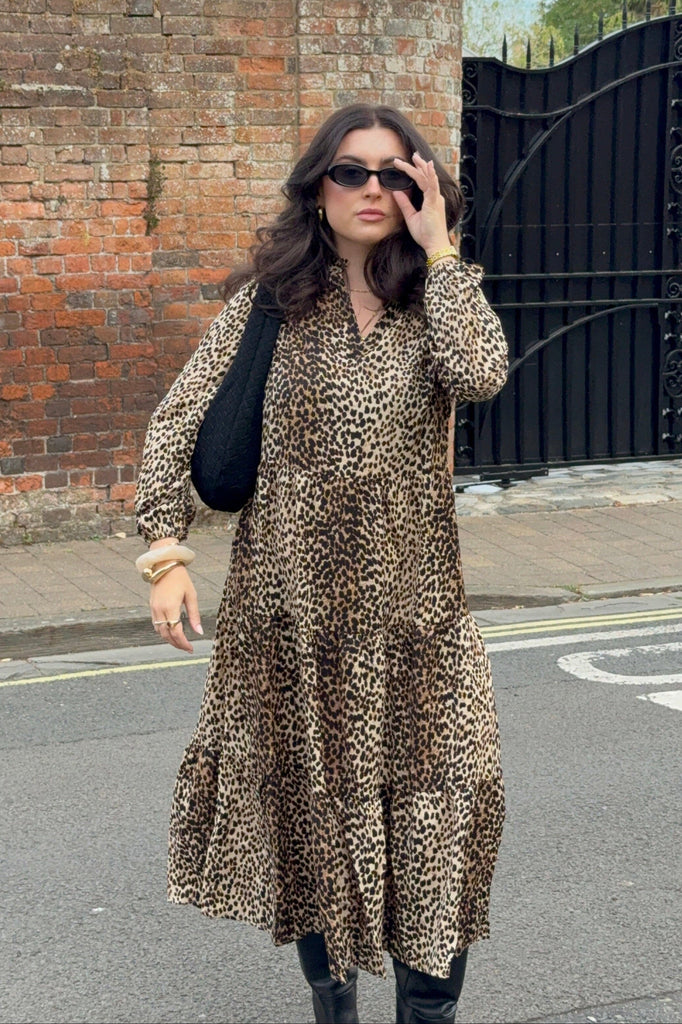 This stunning leopard print dress is a lovely relaxed fit. It has a classic tiered shape with chic flowing layers that move with you, creating a soft, feminine silhouette.