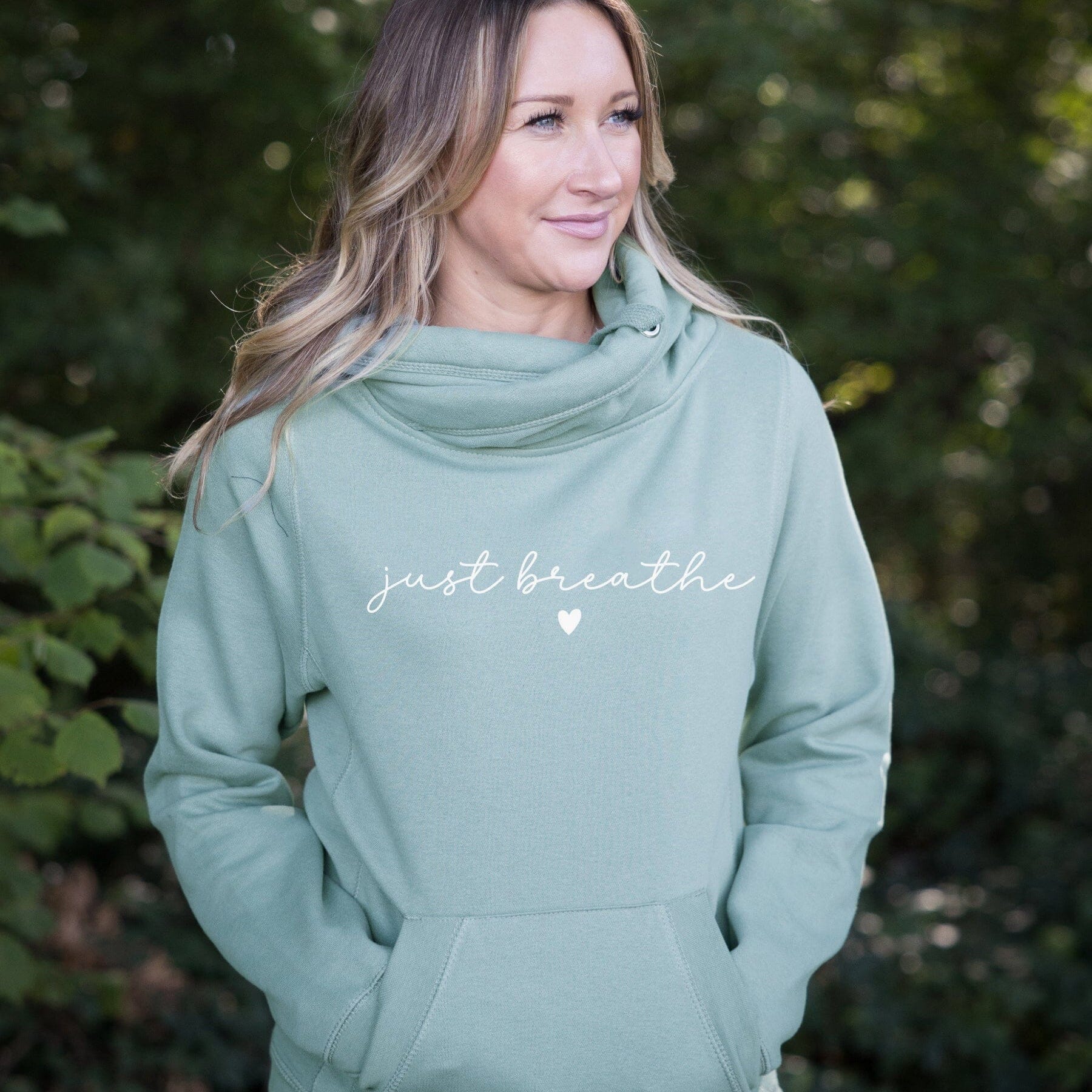 This sage green cowl neck hoodie features the words 'Just Breathe' in stunning handwritten style.