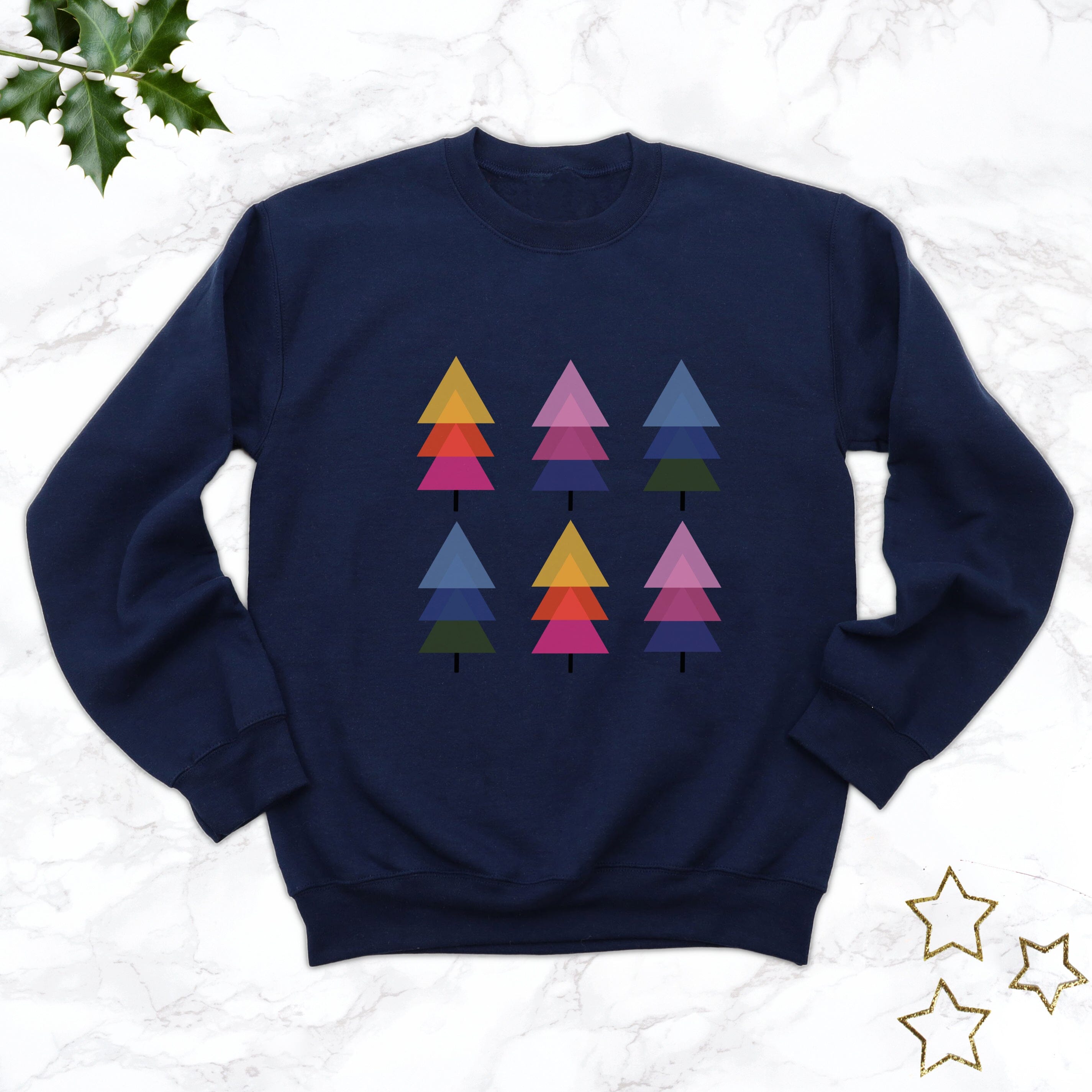 This lovely navy blue sweatshirt has a colouful design with six modern Christmas Trees.