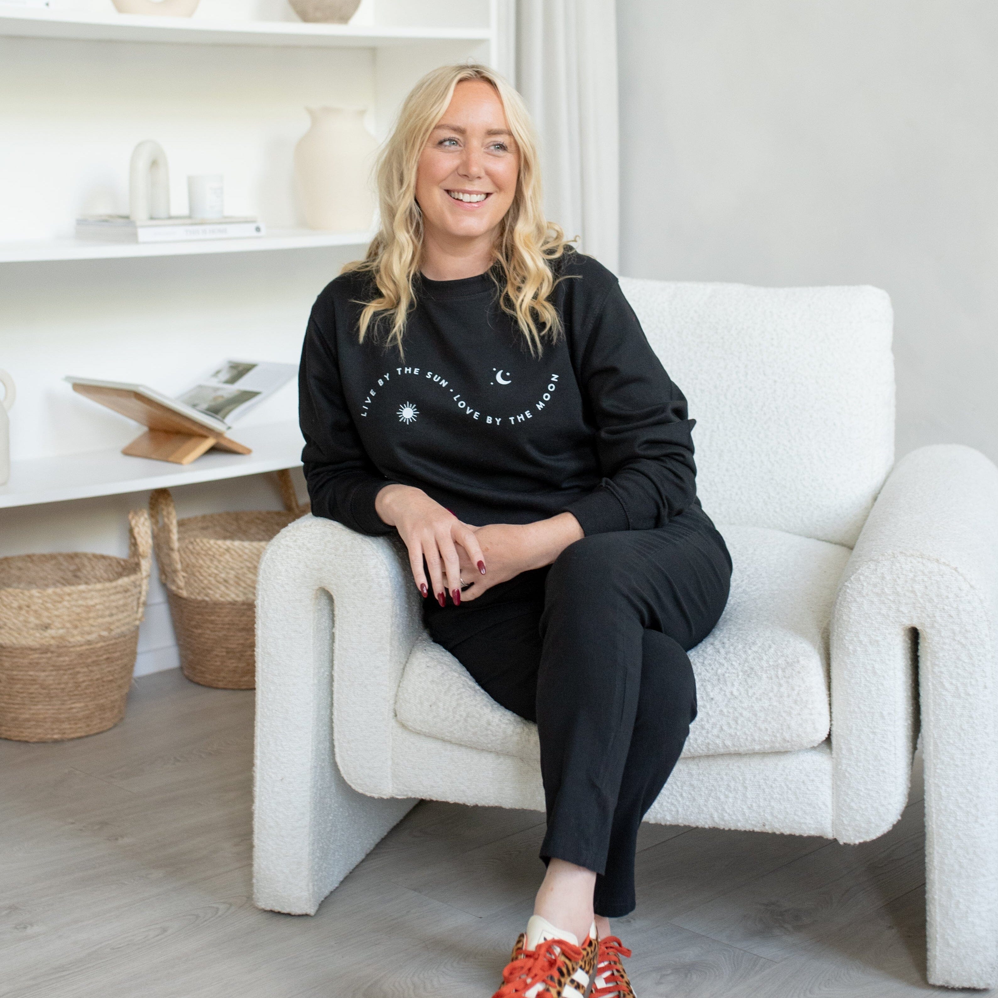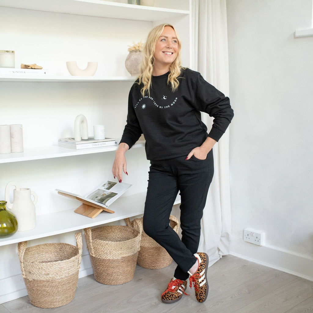 This gorgeous black sweatshirt is part of our collaboration with SJ Strum. It features the words 'Live by the Sun Love by the Moon'.
