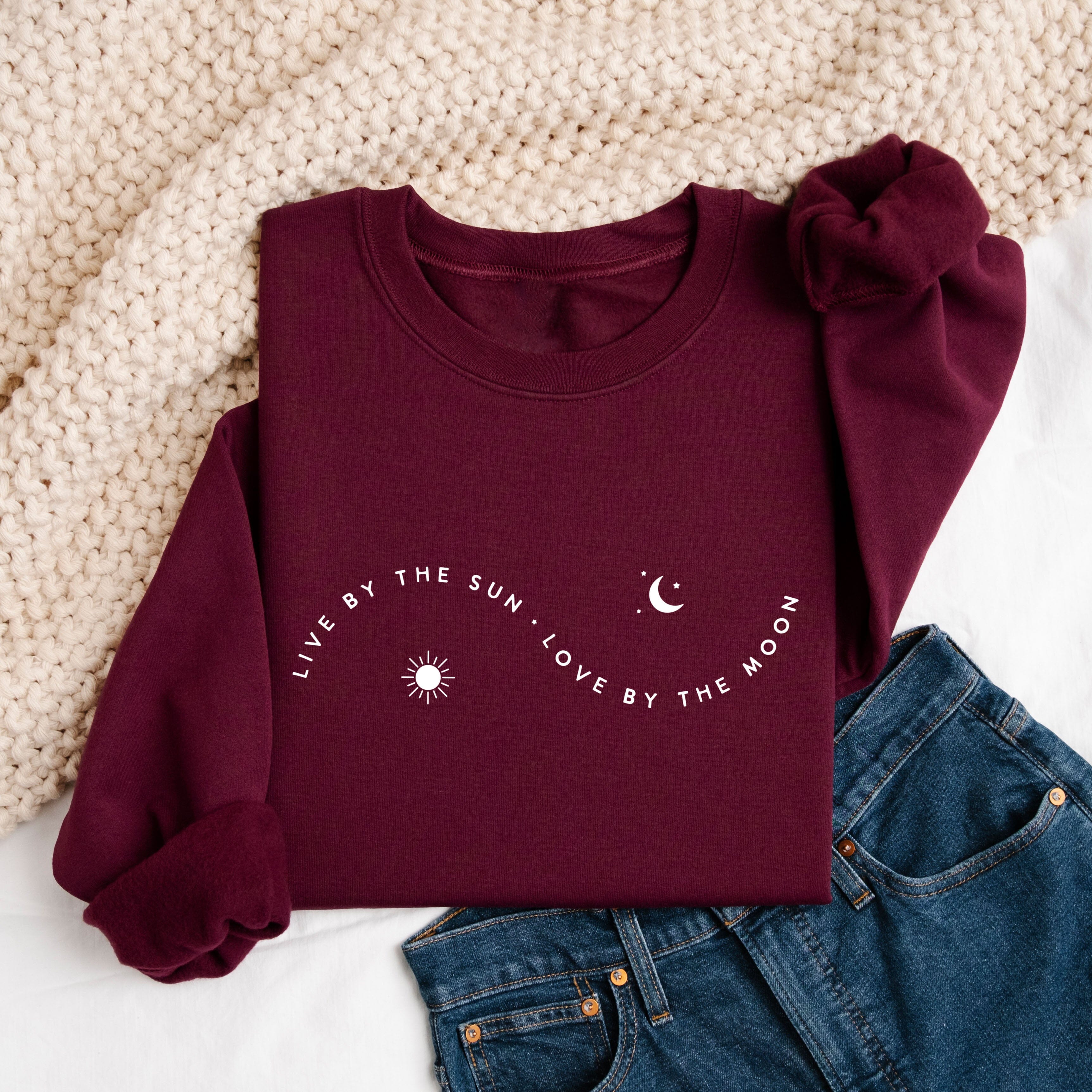 This stunning burgundy sweatshirt, created in partnership with SJ Strum, displays the phrase 'Live by the Sun Love by the Moon' for a touch of whimsical style.