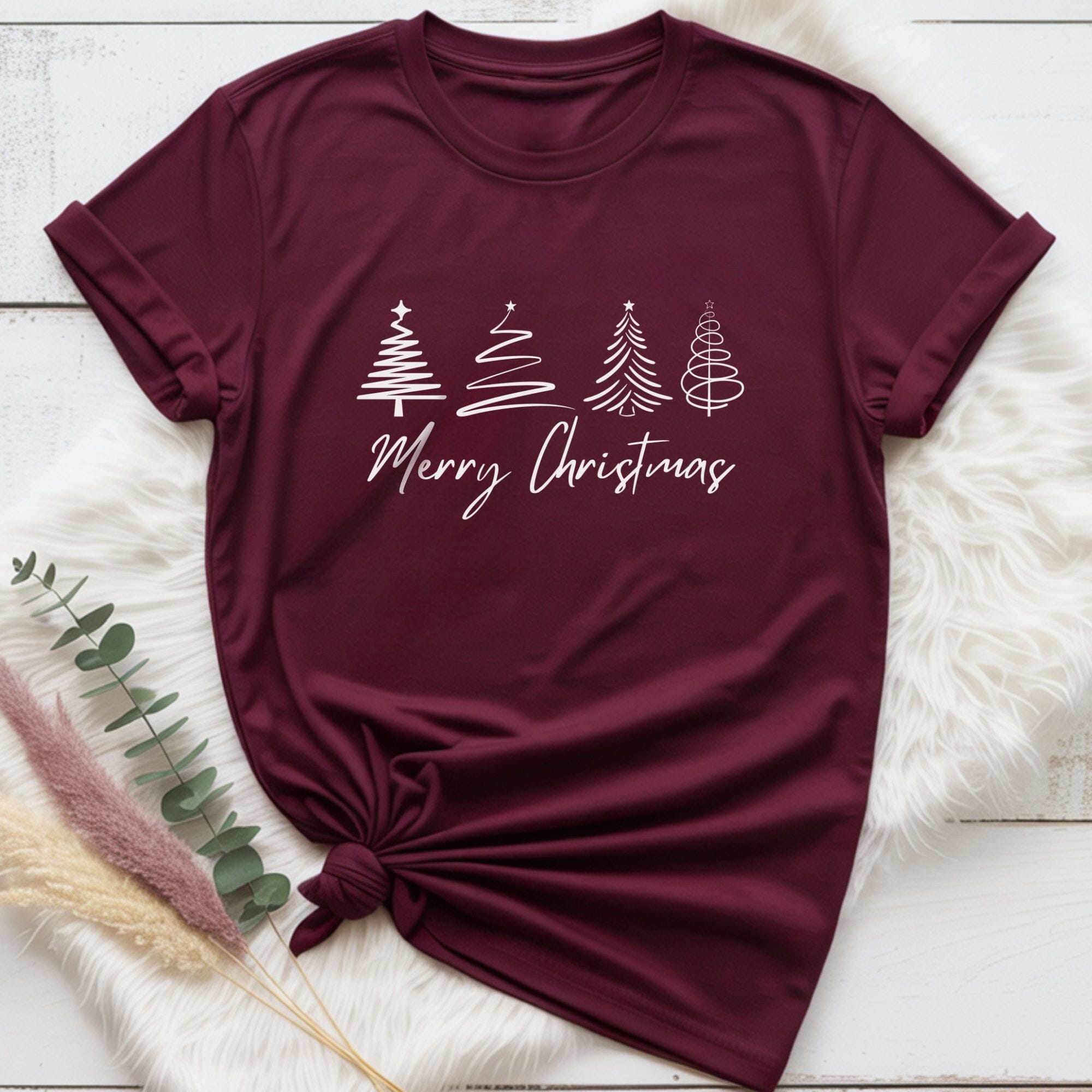 Merry Christmas Illustrated Trees Burgundy T-Shirt