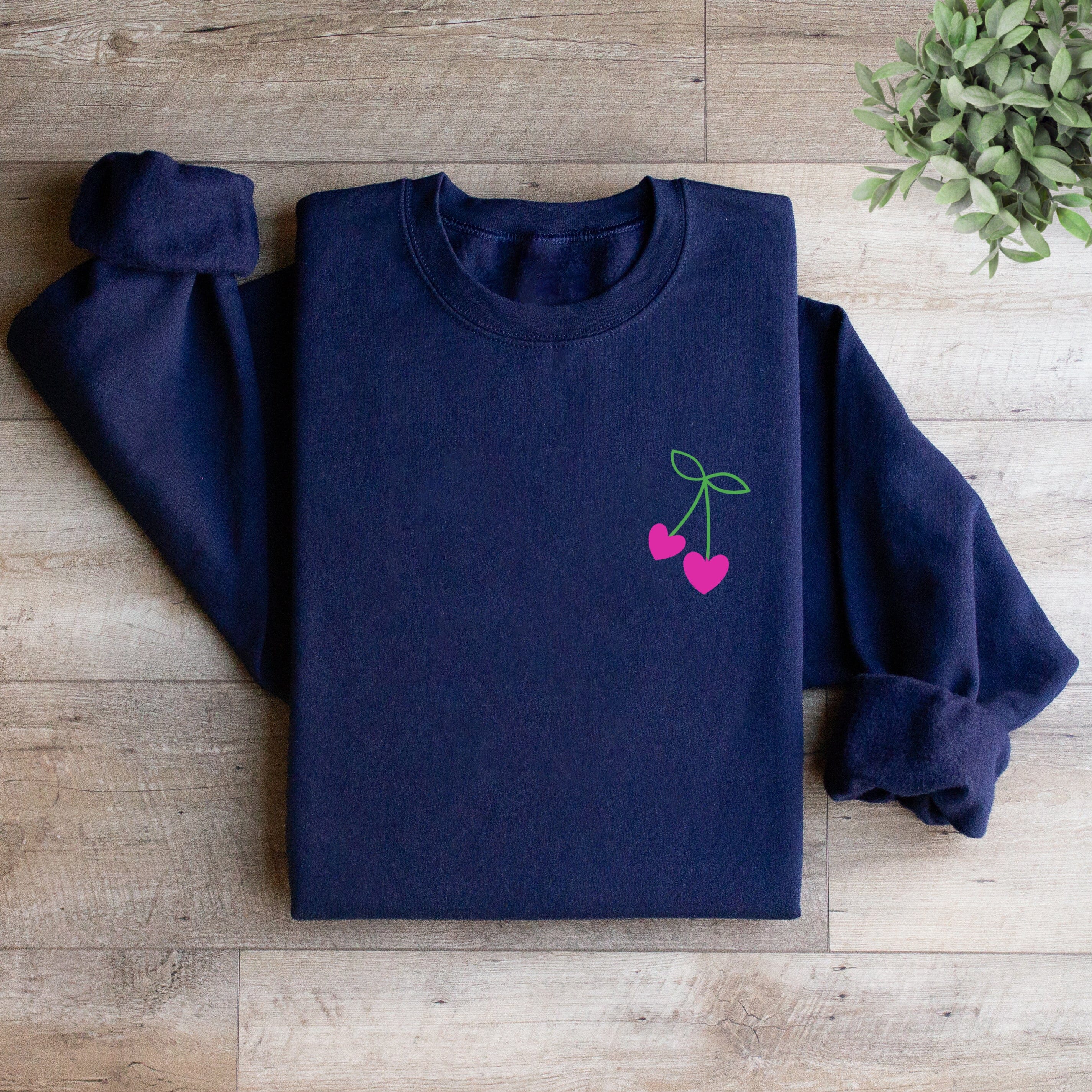 Get ready to fall in love with this adorable sweatshirt! The charming cherry pocket design is on a classic navy sweater, making it the perfect addition to your wardrobe.