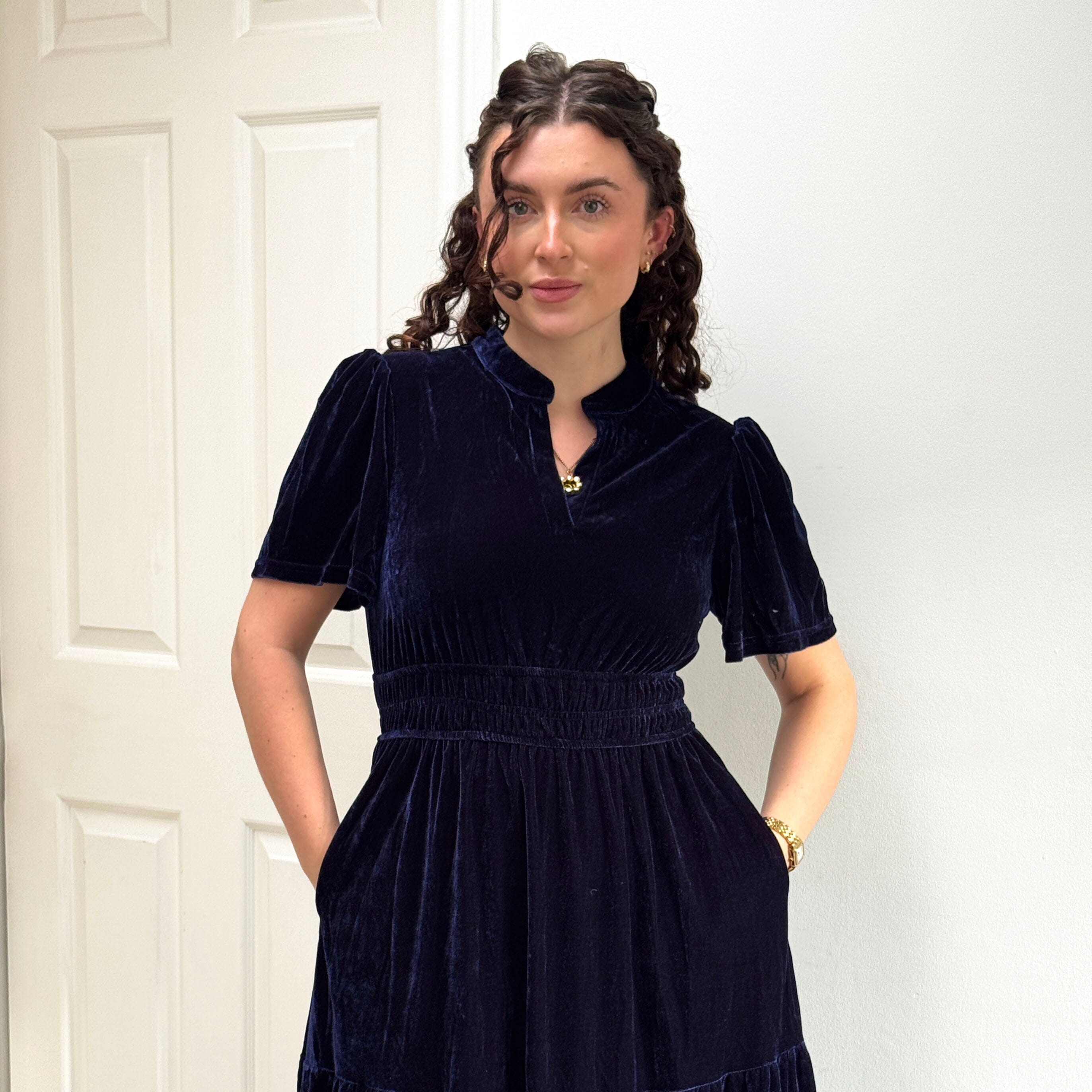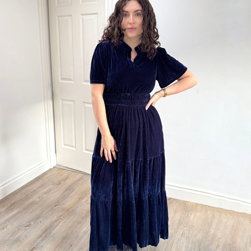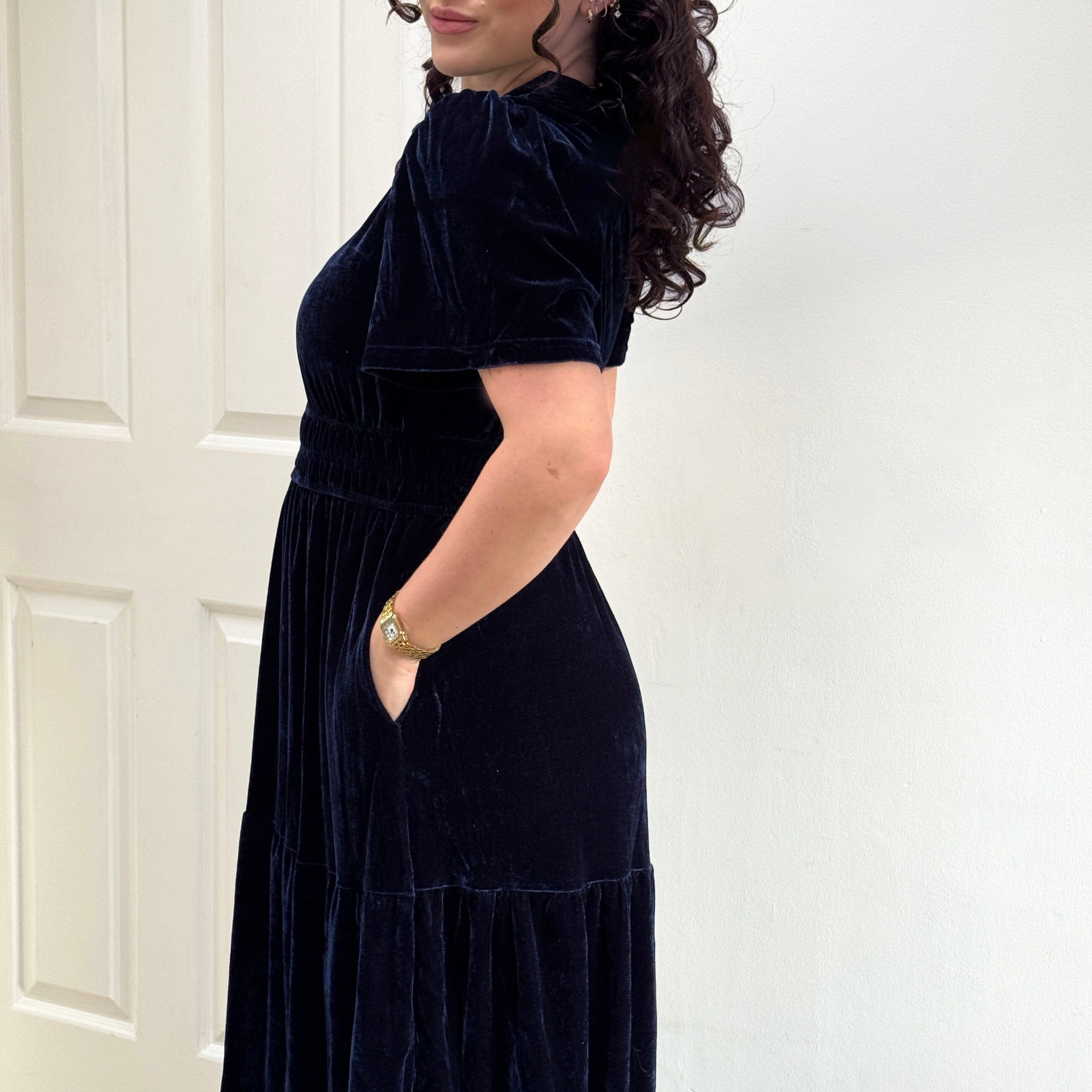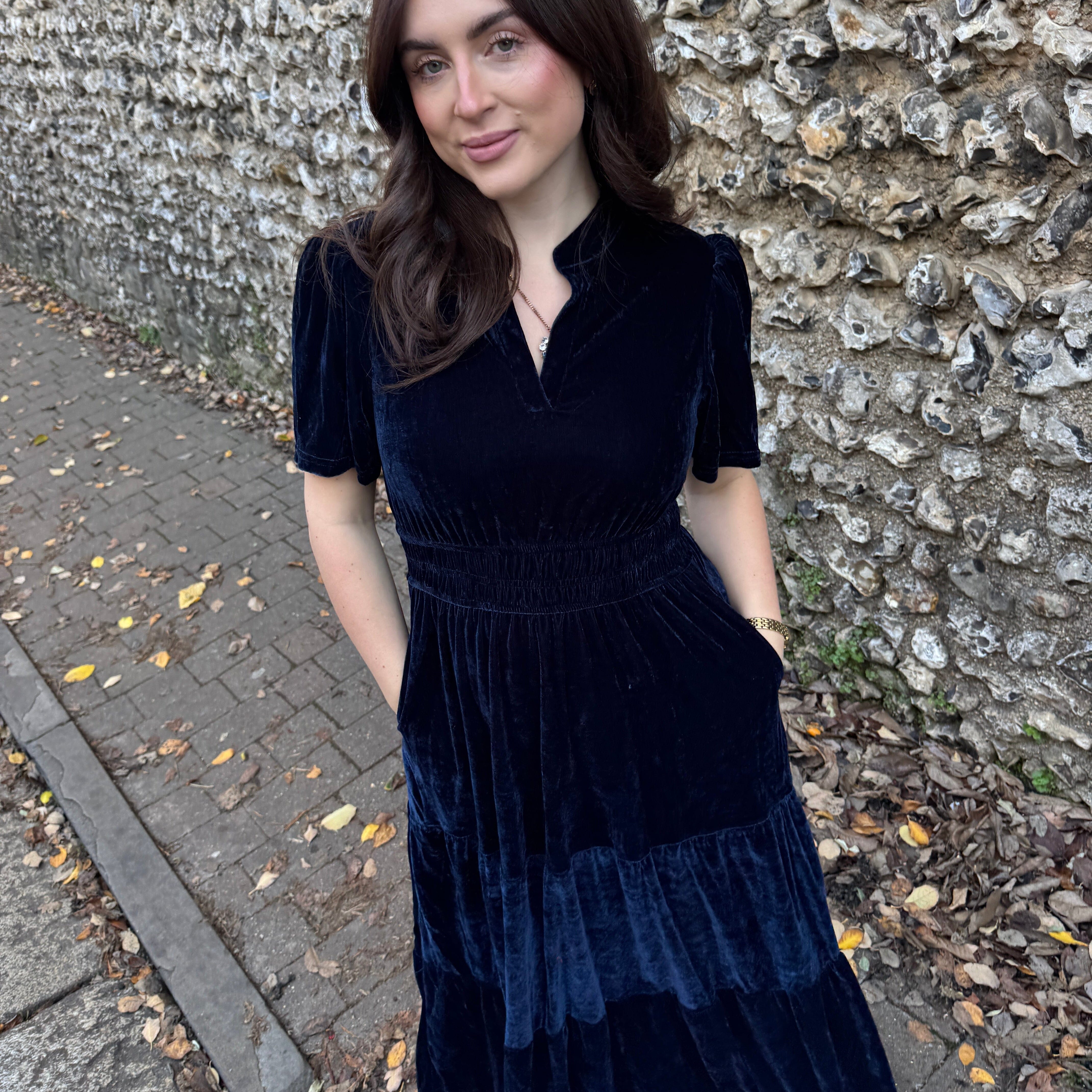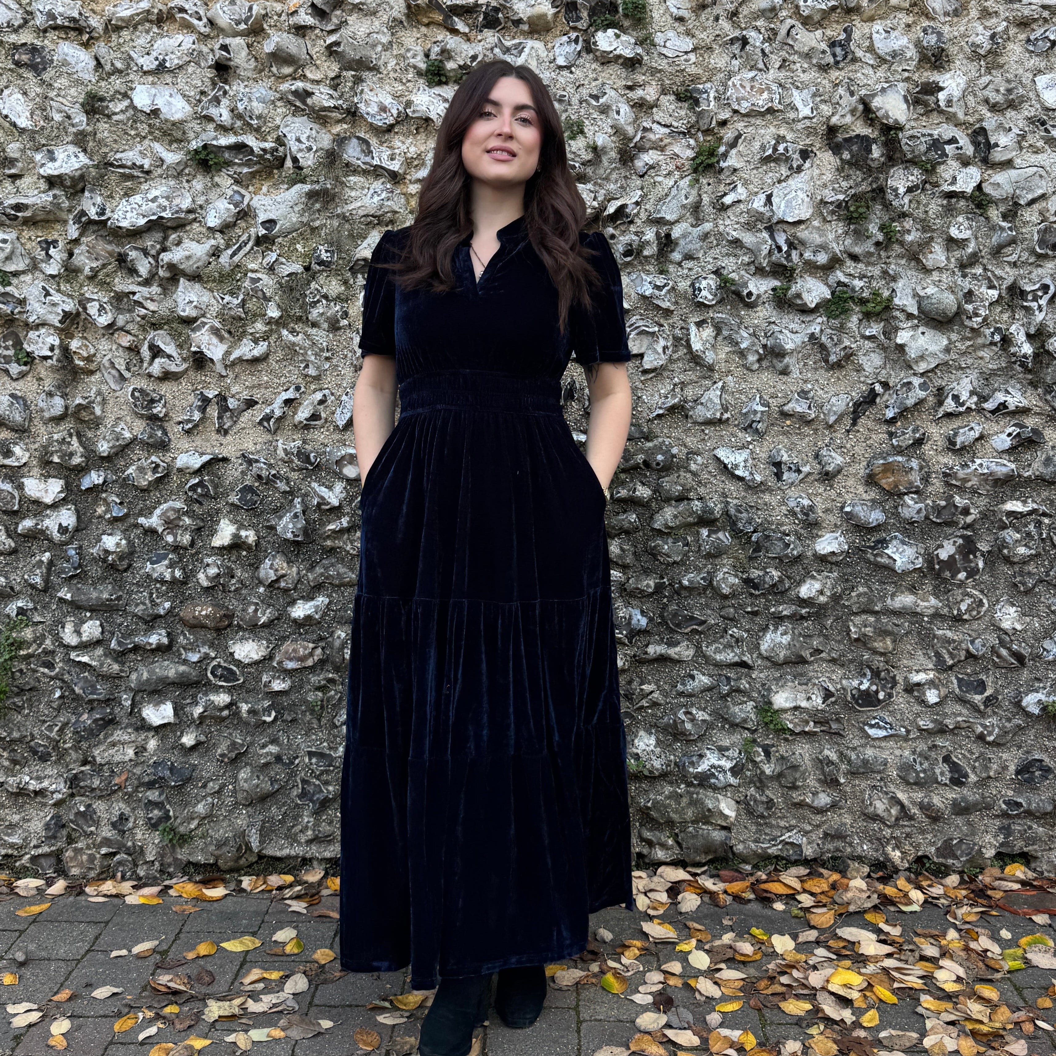 This stunning maxi dress is super soft navy velvet. It is the perfect dress for the festive season, made from flowing velvet fabric.