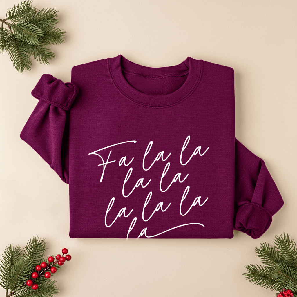 The perfect Christmas Sweatshirt in lovely plum! It features the words Fa La La in a handwritten style in white.