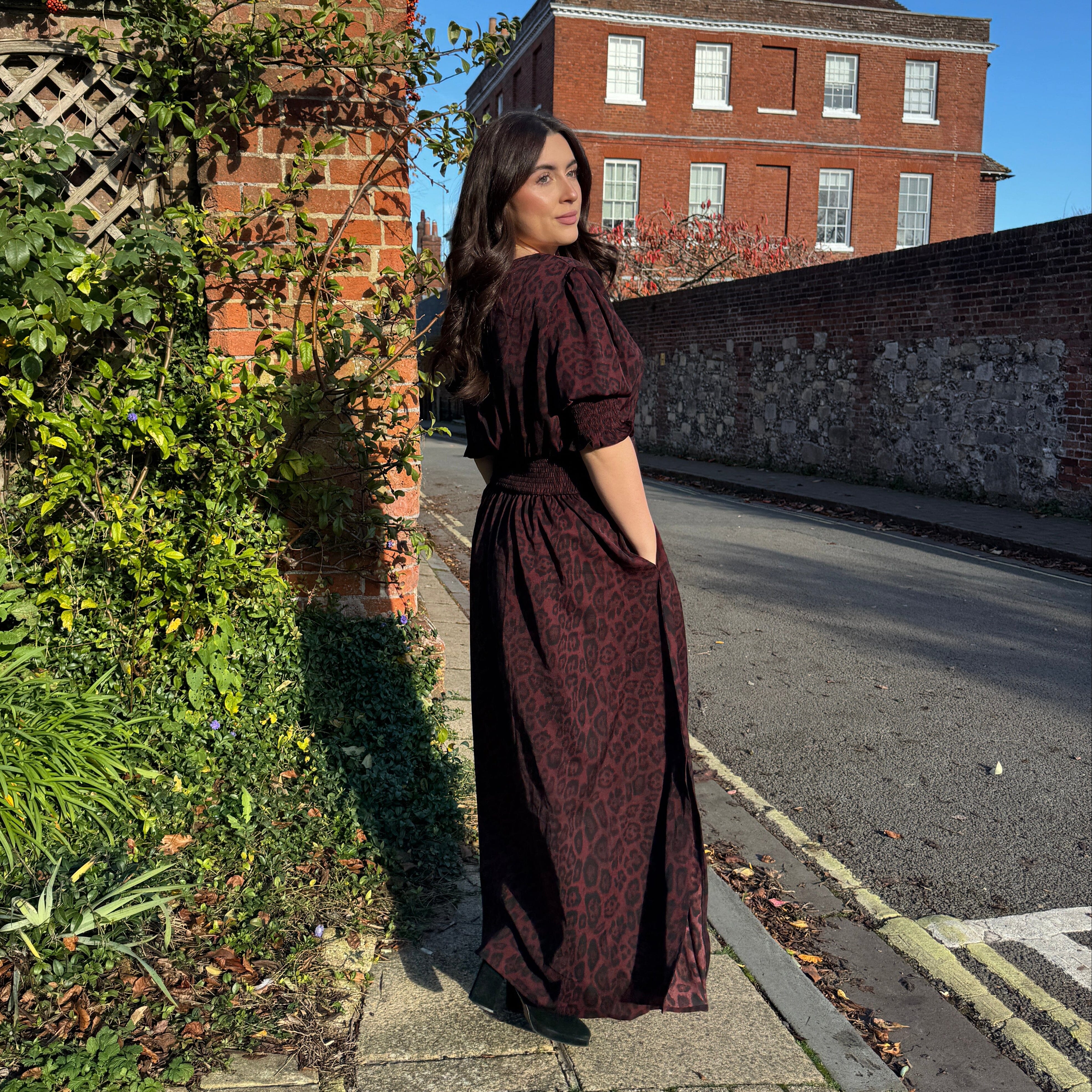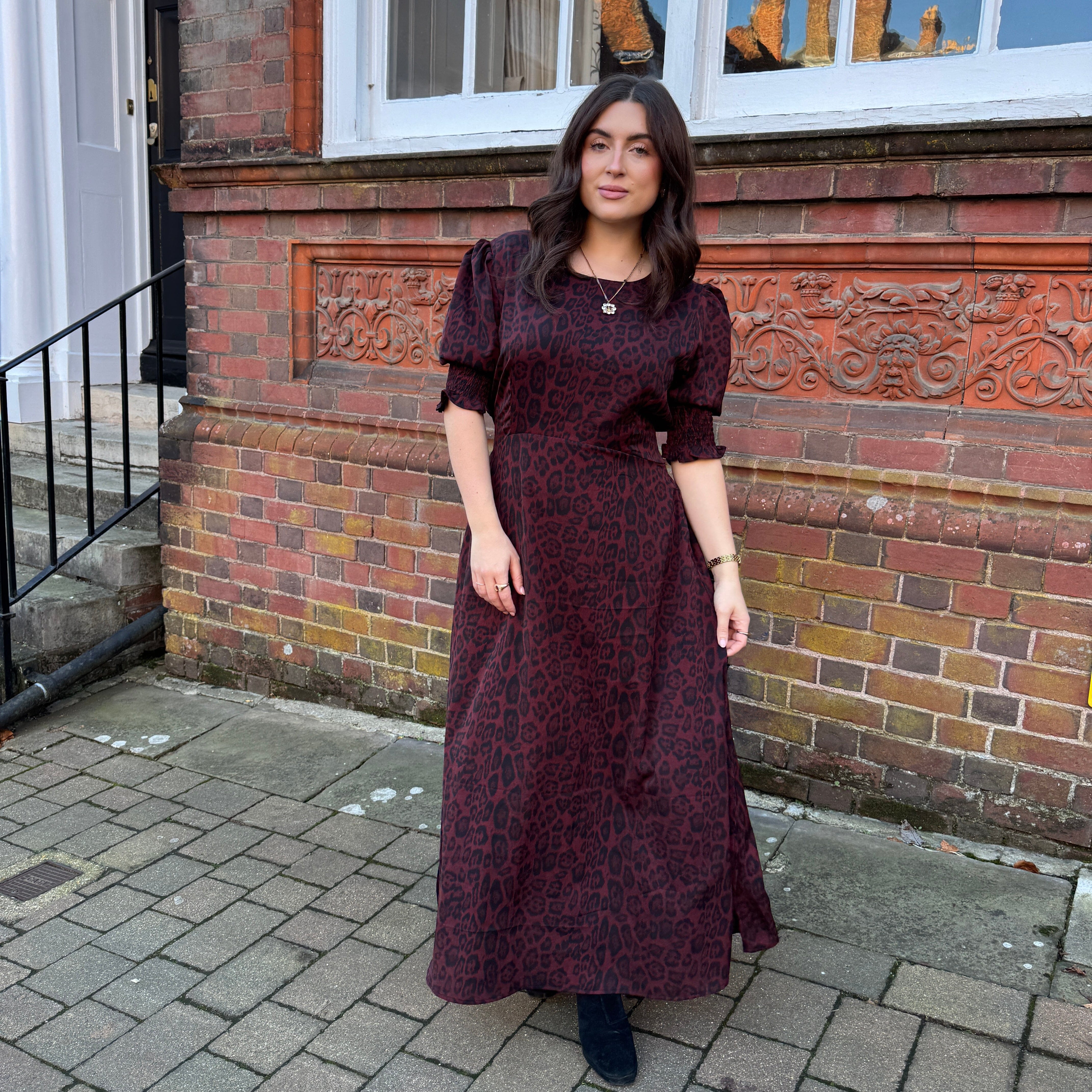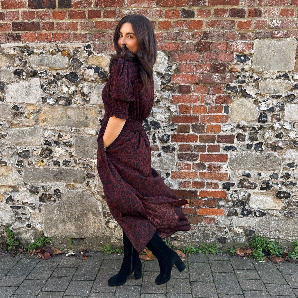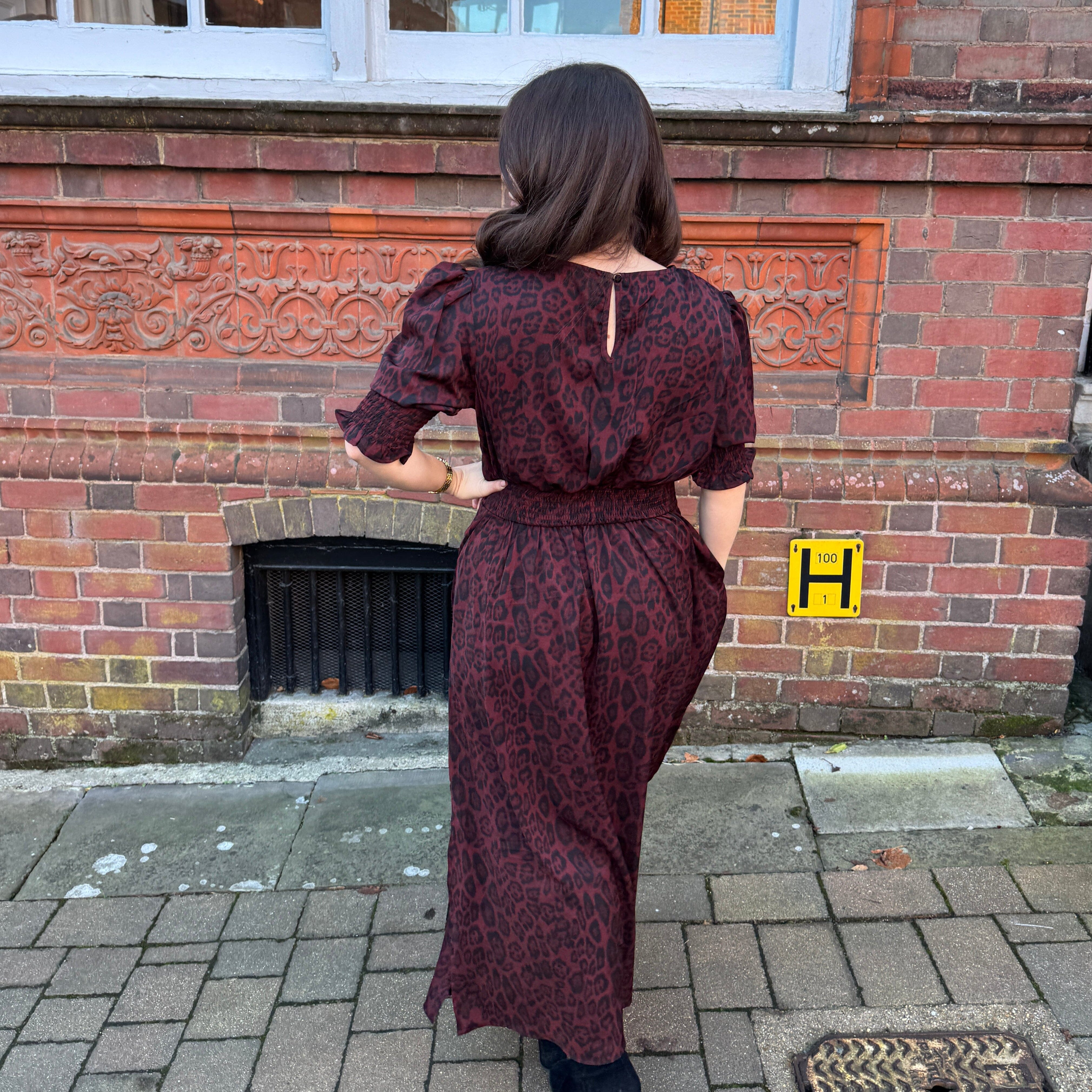 Created from soft, flowing fabric this midi tea dress features a berry coloured leopard print for a look that’s both timeless and effortlessly stylish.