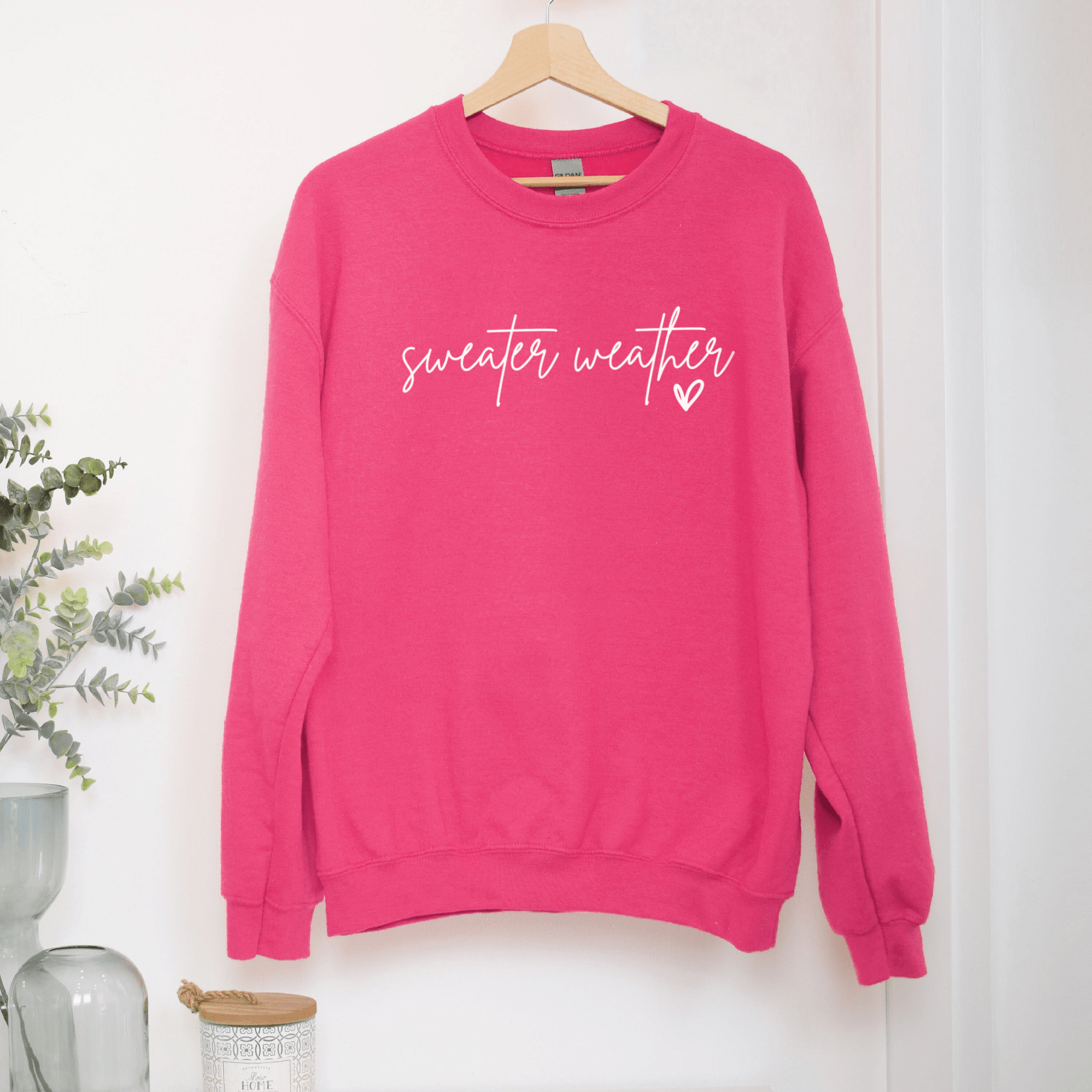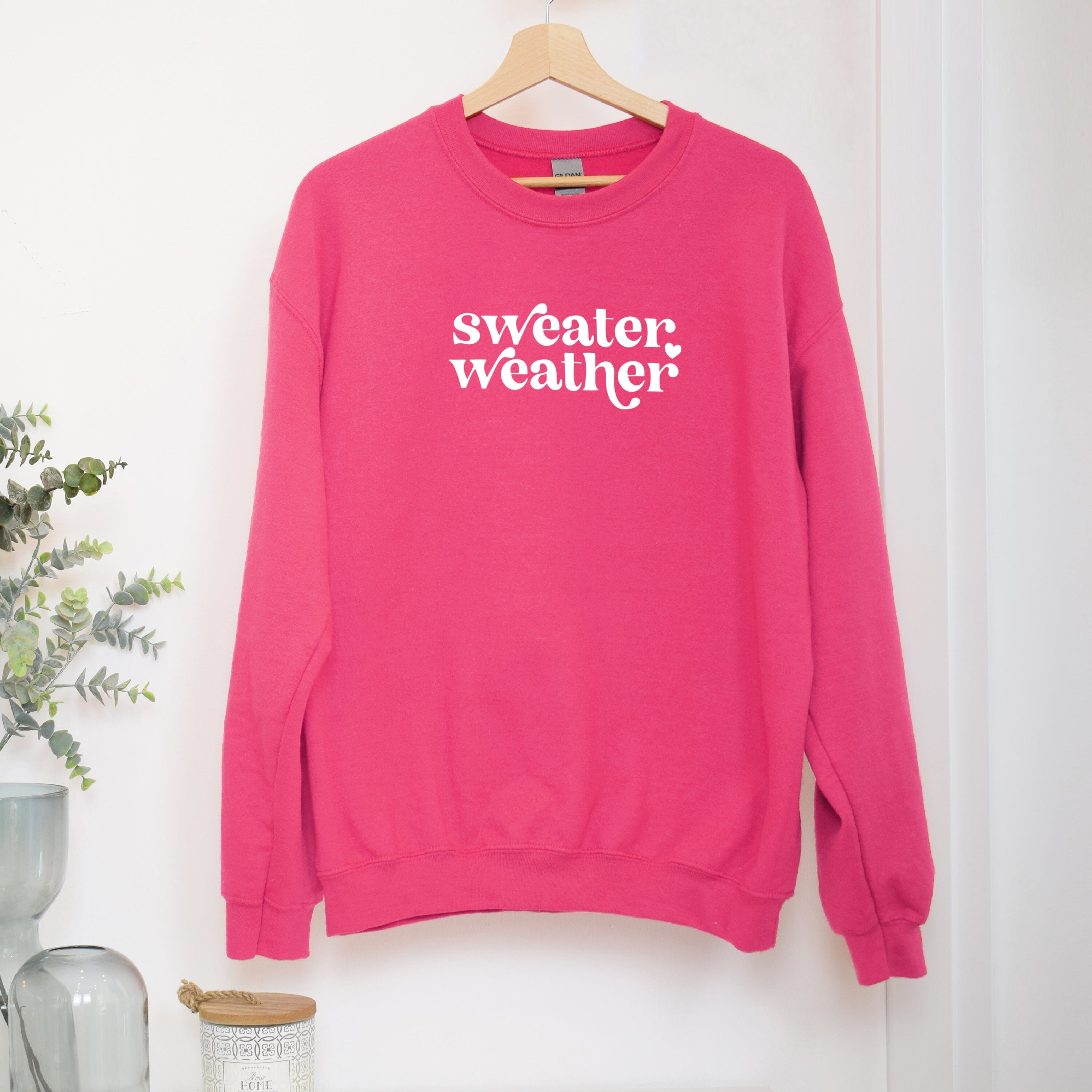 This bright pink sweatshirt is perfect for those chilly autumn days. Its vibrant colour and cosy material make it a must-have for any wardrobe. The phrase "Sweater Weather" is beautifully written in white letters, adding a fun and stylish touch.