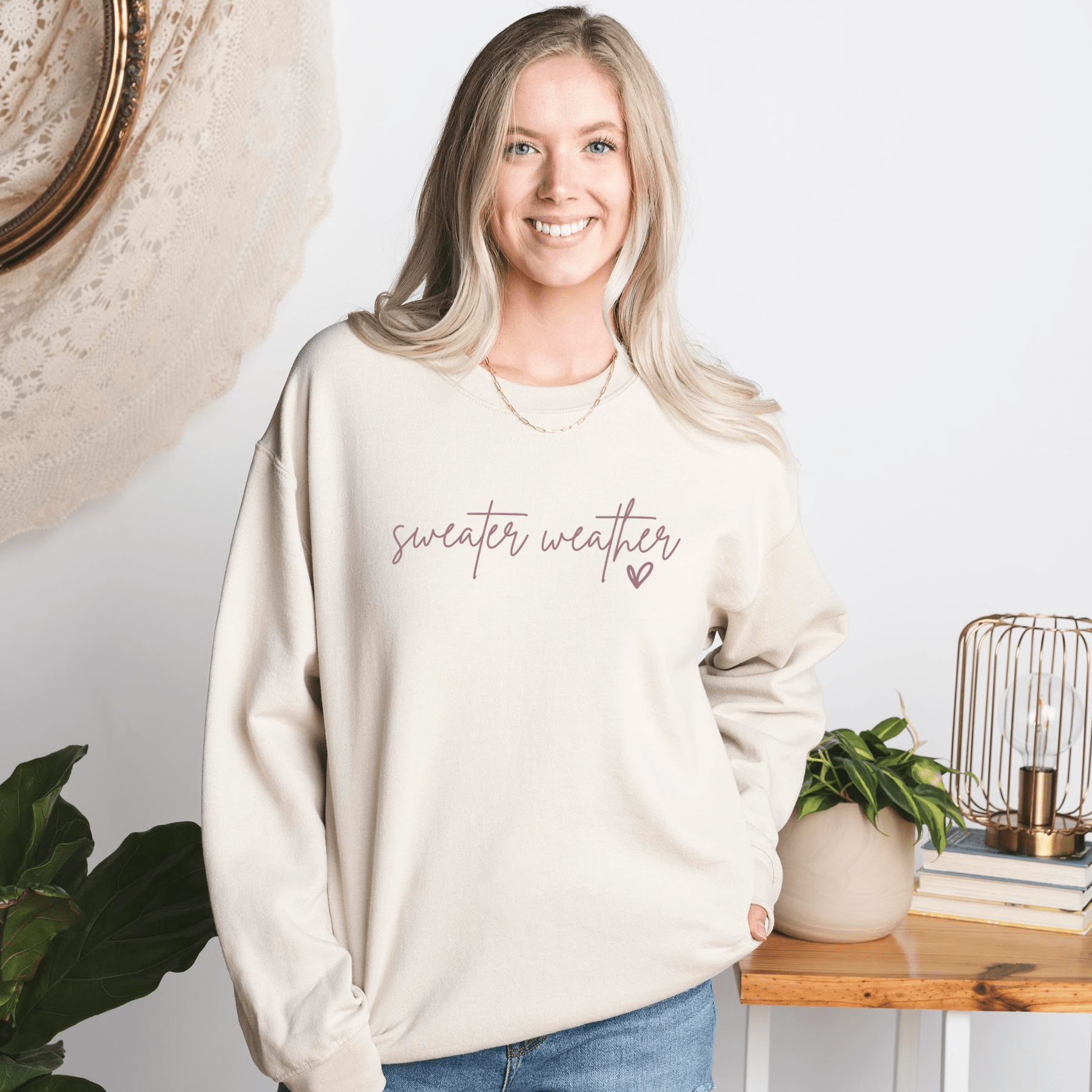 This cream vanilla sweatshirt is perfect Autumn and Winter. Its warm material and eye-catching design make it an essential addition to any wardrobe. The phrase "Sweater Weather" is in a stylish font in a gorgeous pinky plum colour.