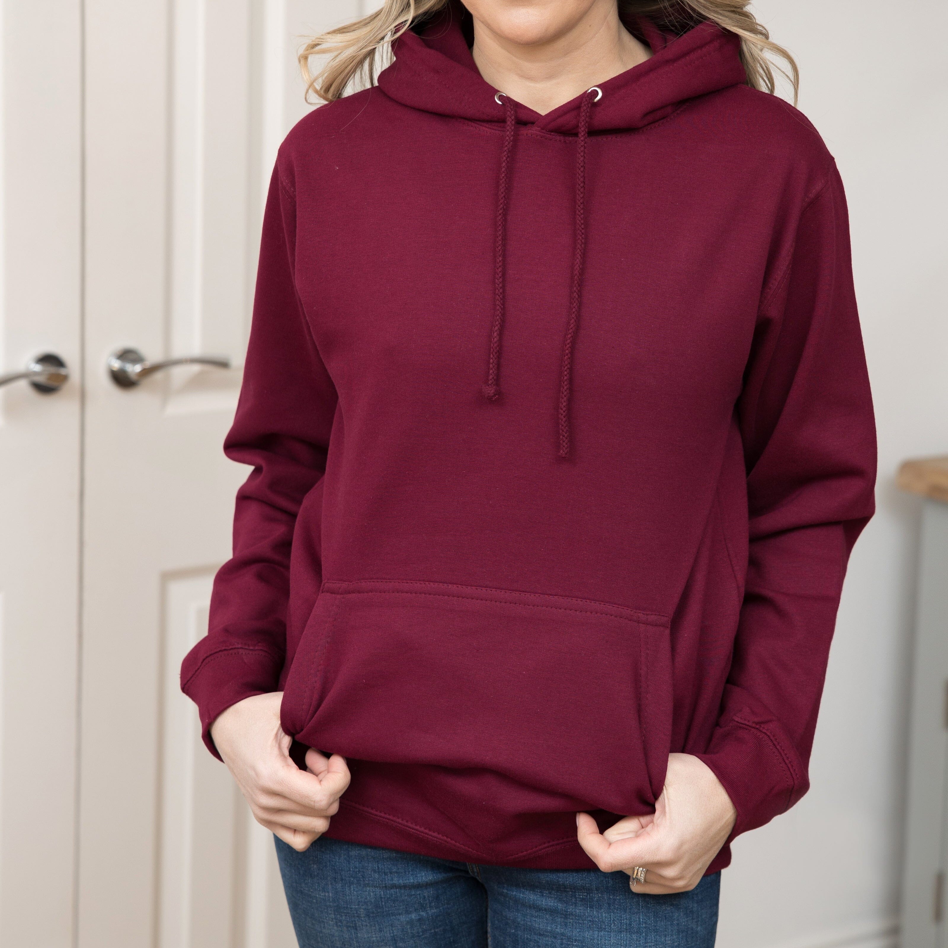 We use premium quality hoodies, that will look gorgeous wash after wash. Available in burgundy, it features a front pouch and a drawstring hood. The front of the hoodie does not have any printing or embroidery.