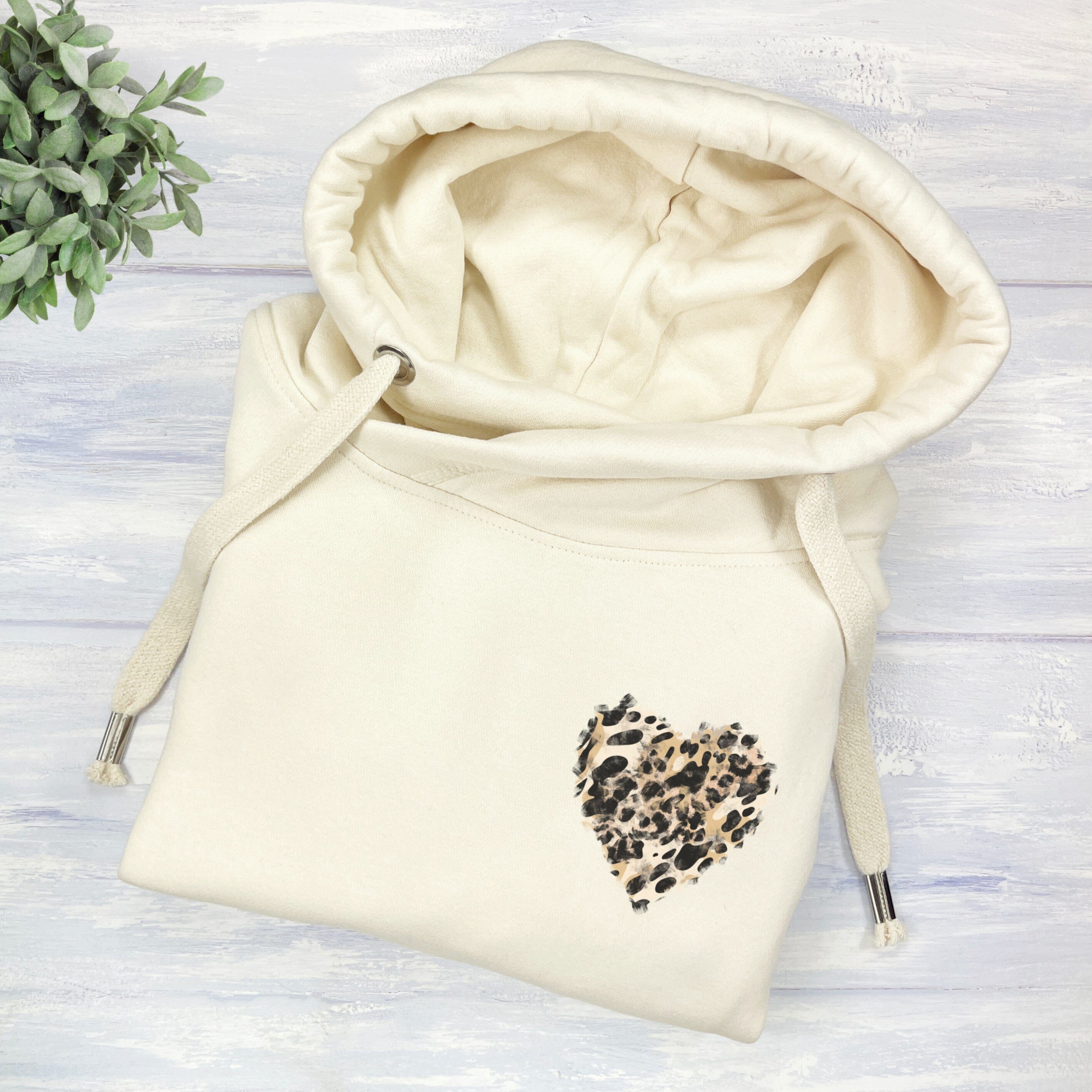 Wrap yourself in cosy comfort with this vanilla cowl neck hoodie. In a warm cream colour it features a leopard print watercolour painted heart.