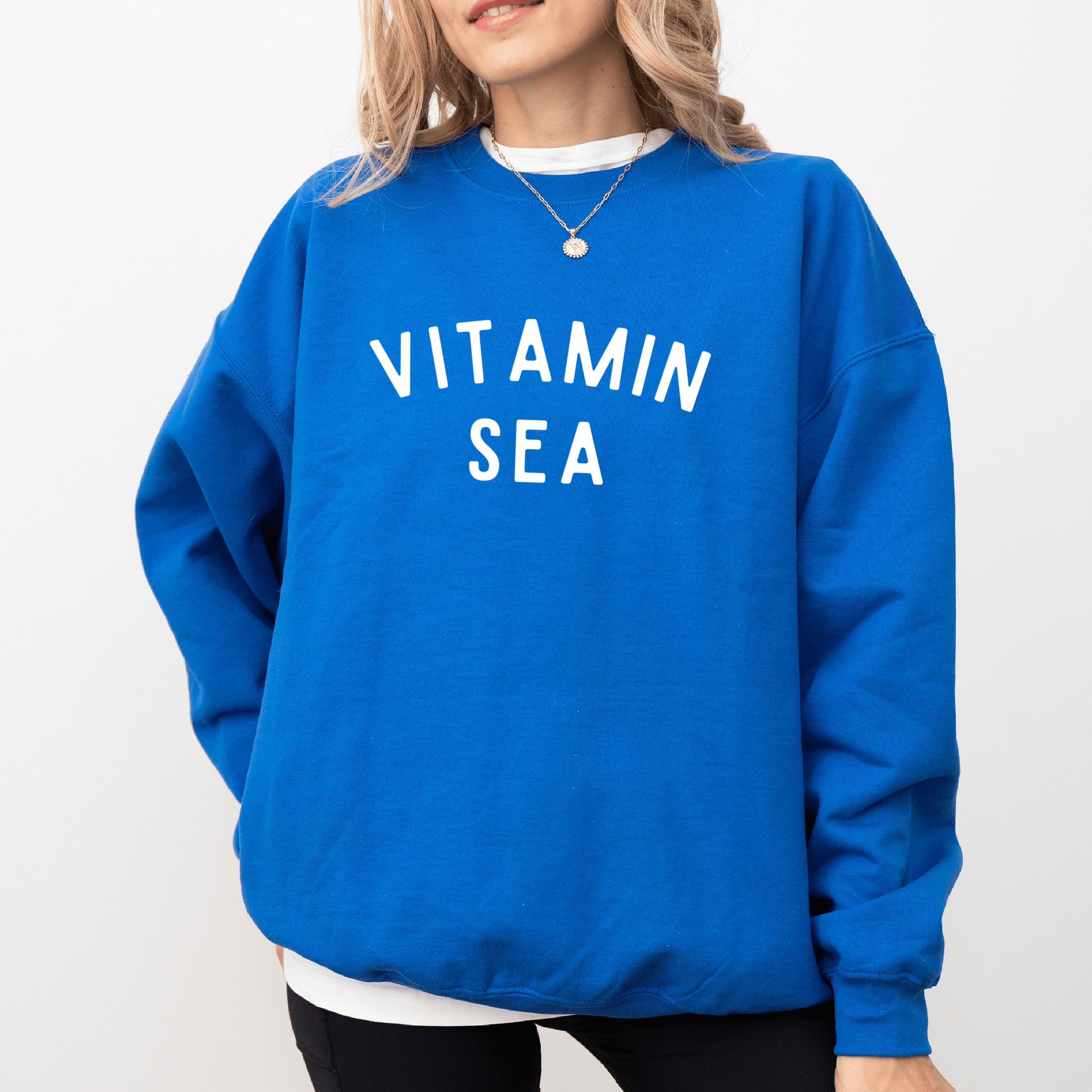 Our bestselling Vitamin Sea Sweatshirt in available in a stunning new colour. This gorgeous royal blue colour features this playful slogan in white.