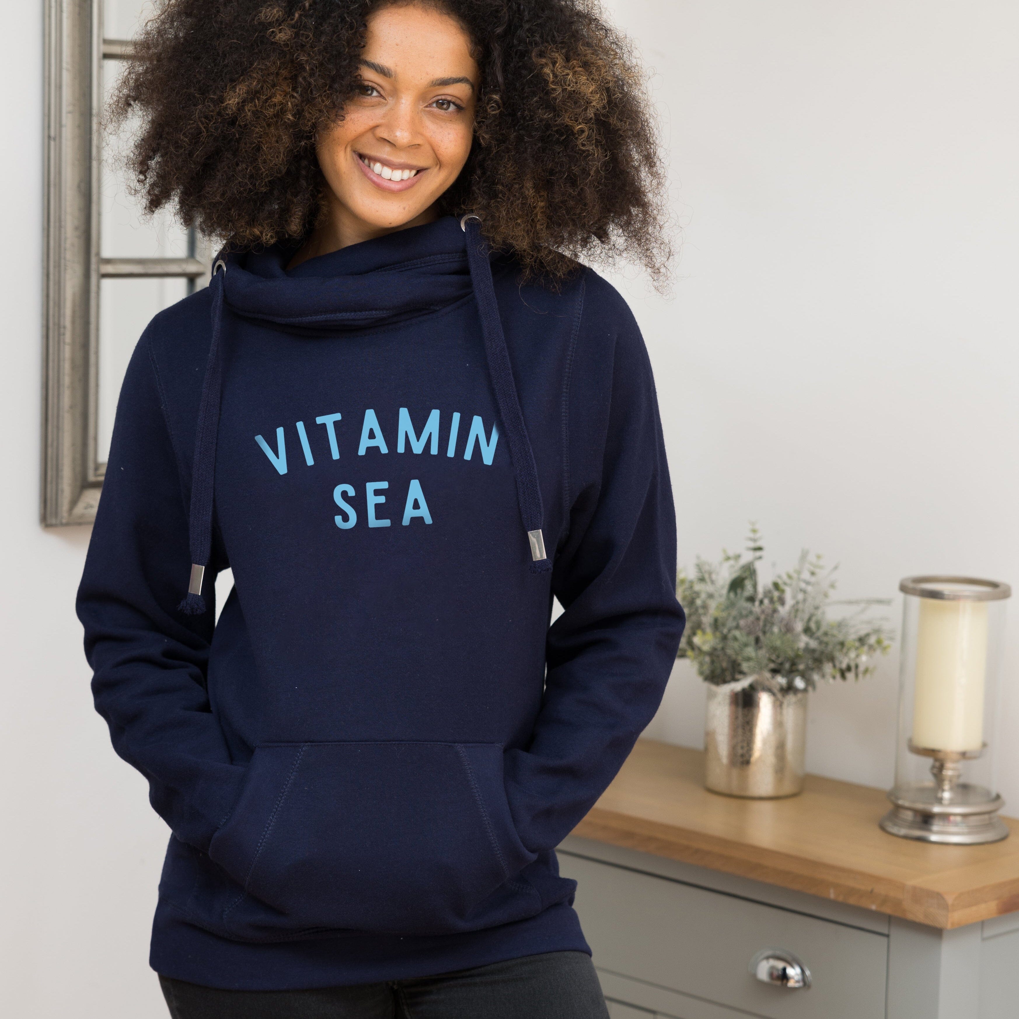 This cosy cross-neck hoodie features the words 'Vitamin Sea' in a stylish modern font. In a gorgeous blue, it is a lovely contrast to our classic navy cowl neck hoodie.
