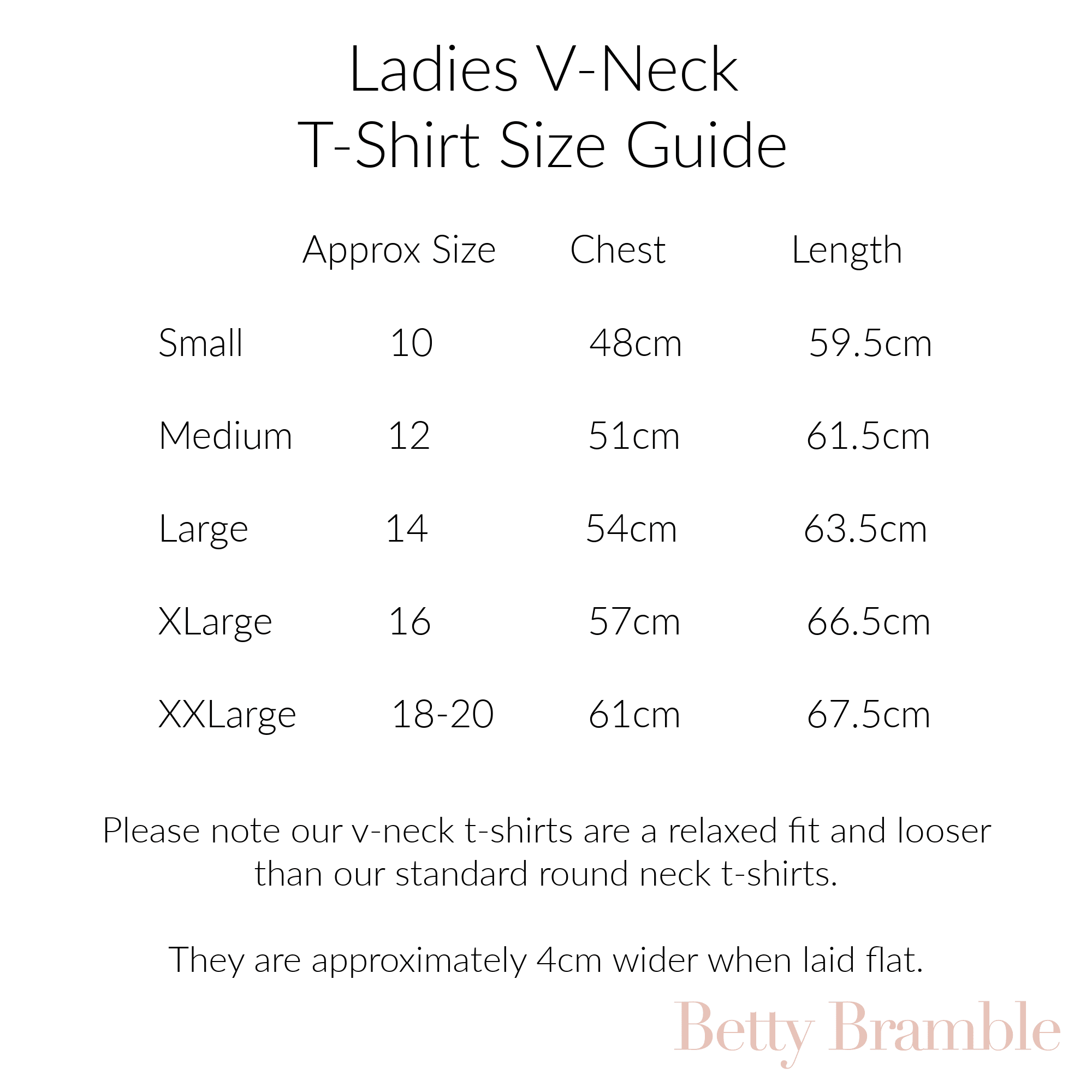 They are a relaxed fit and looser than our crew neck ladies t-shirts. When laid flat they are approximately 4cm wider across the chest (see the size guide attached).