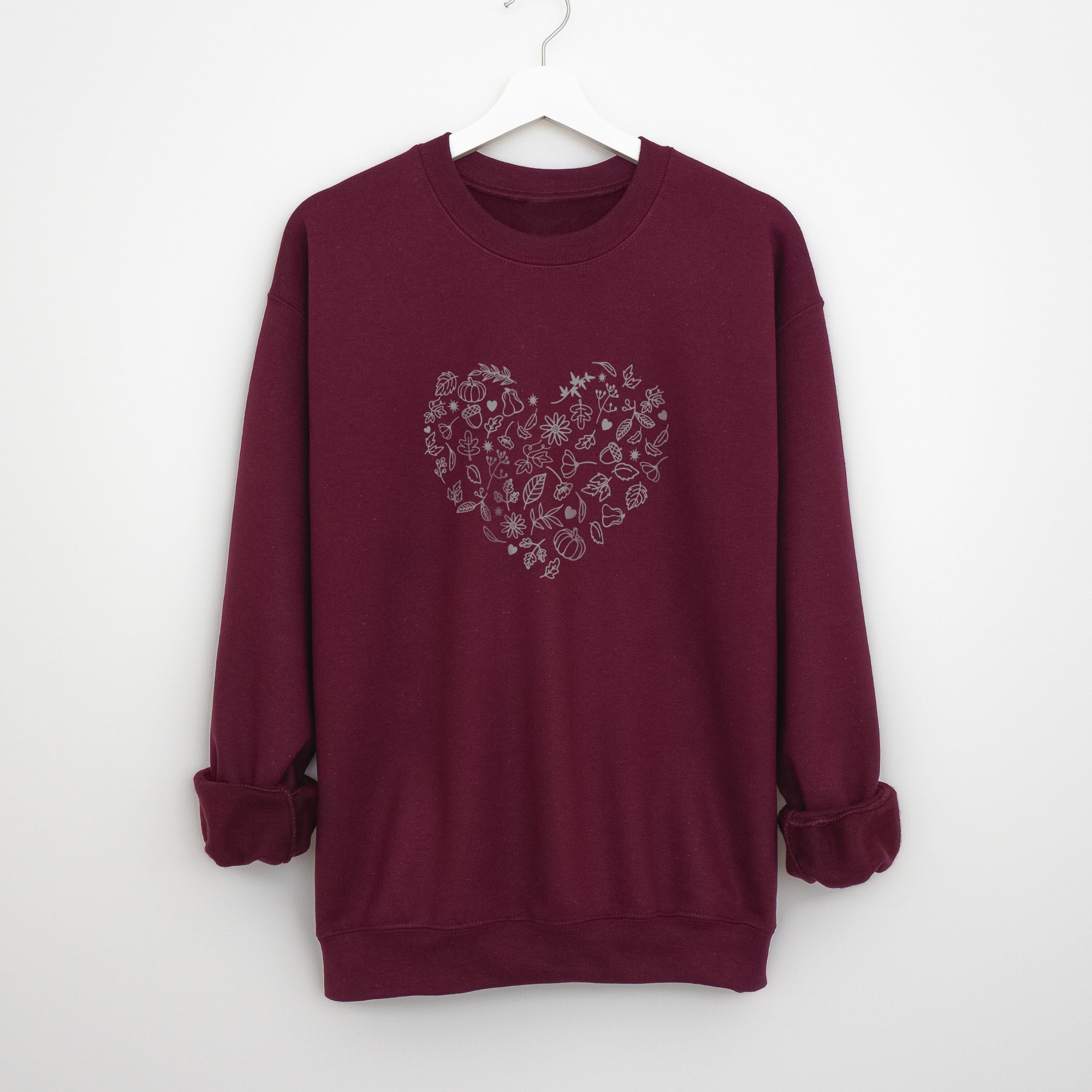 This cosy sweatshirt features a lovely heart with gorgeous woodland illustrations. The design in light grey is a lovely contrast to the warm plum sweater.