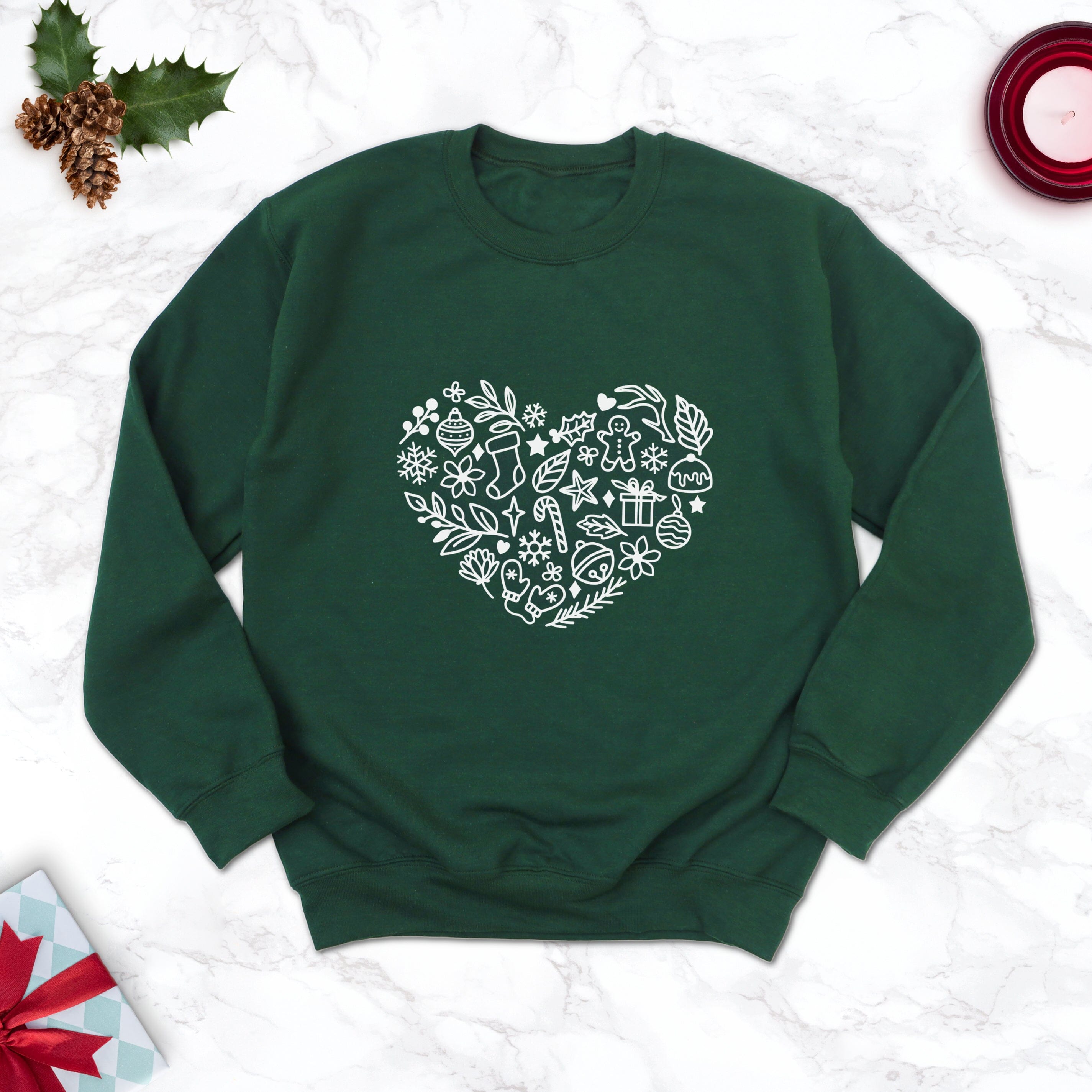 A chic shade for Christmas, this lovely forest green sweatshirt features a festive heart. The heart is created of lots of hand drawn Christmas doodles of everything we love about this season!